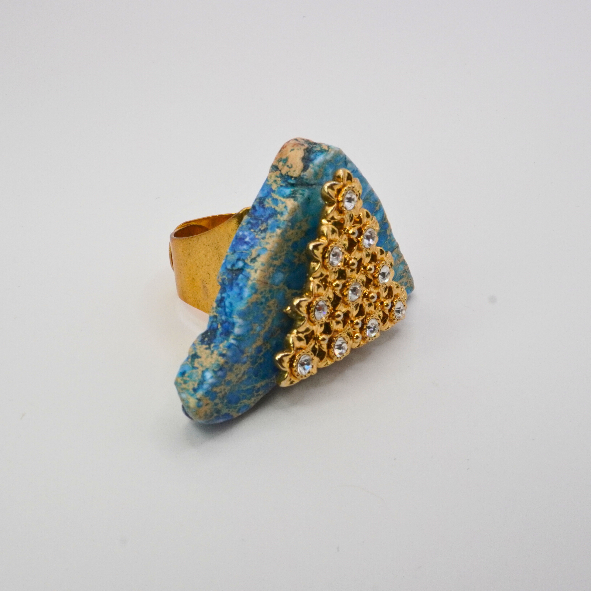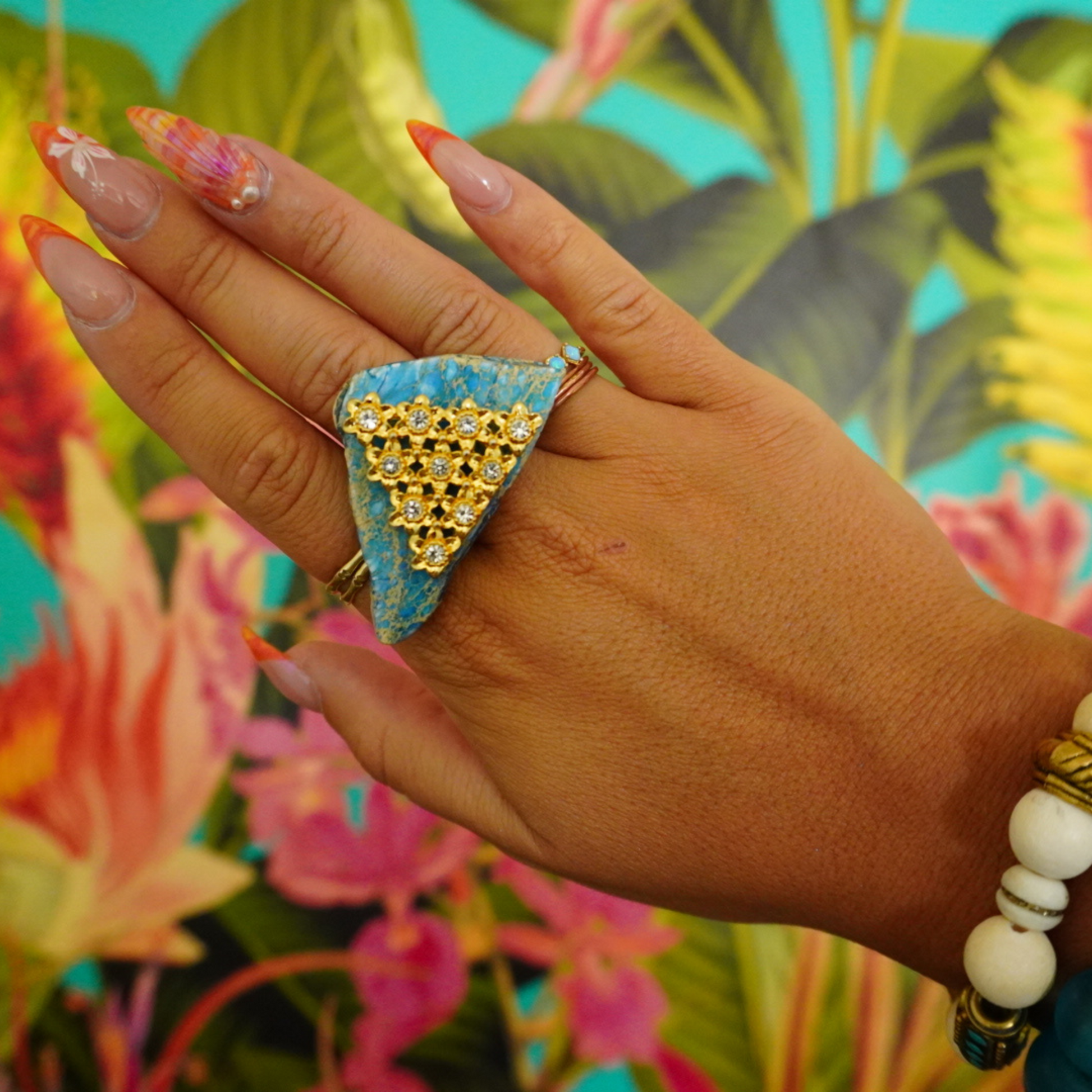 Like ocean waves in stone form. This blue agate ring features soft swirls of pale blue that feel calm, cool, and coastal. It’s the kind of piece that looks just as good on vacation as it does back at the office.