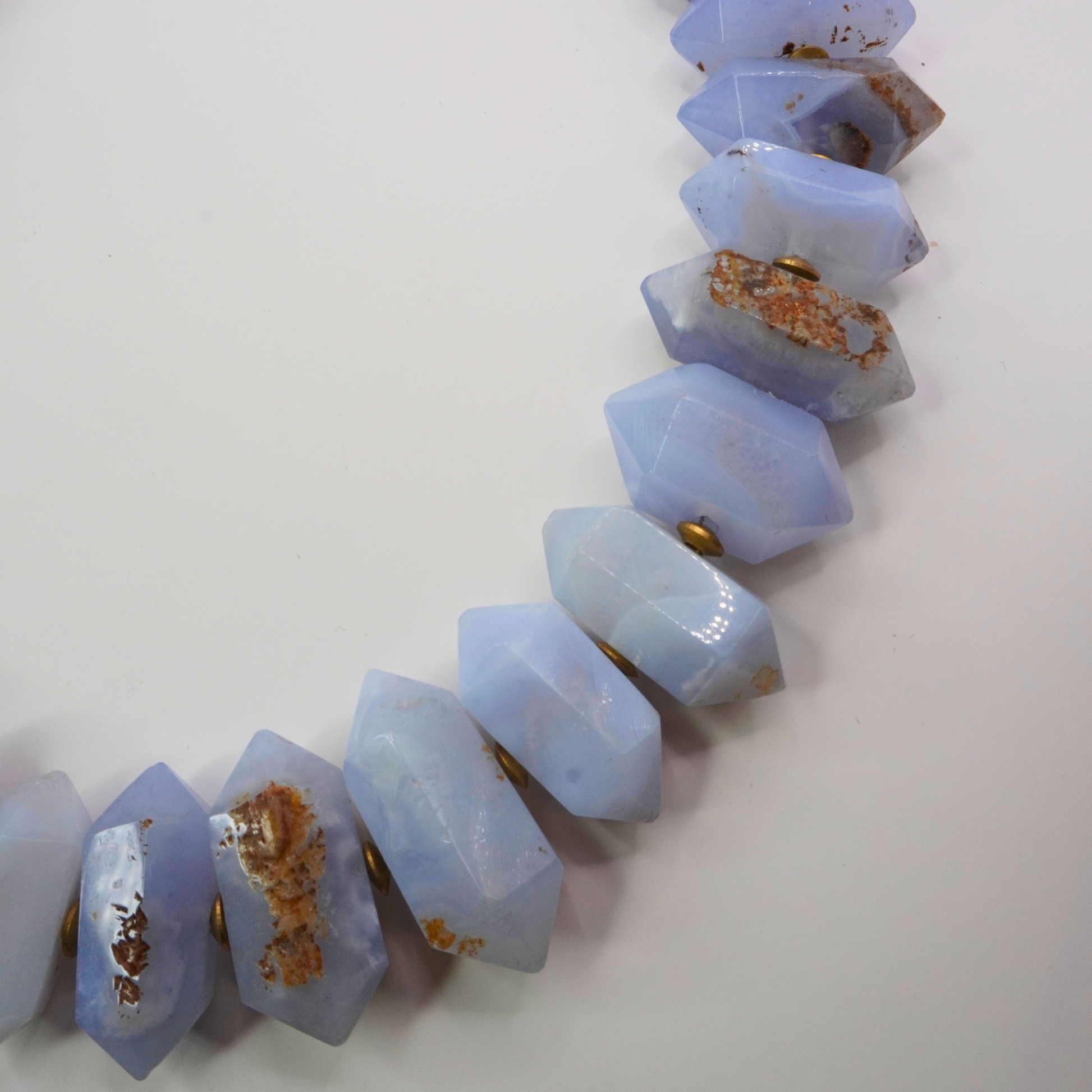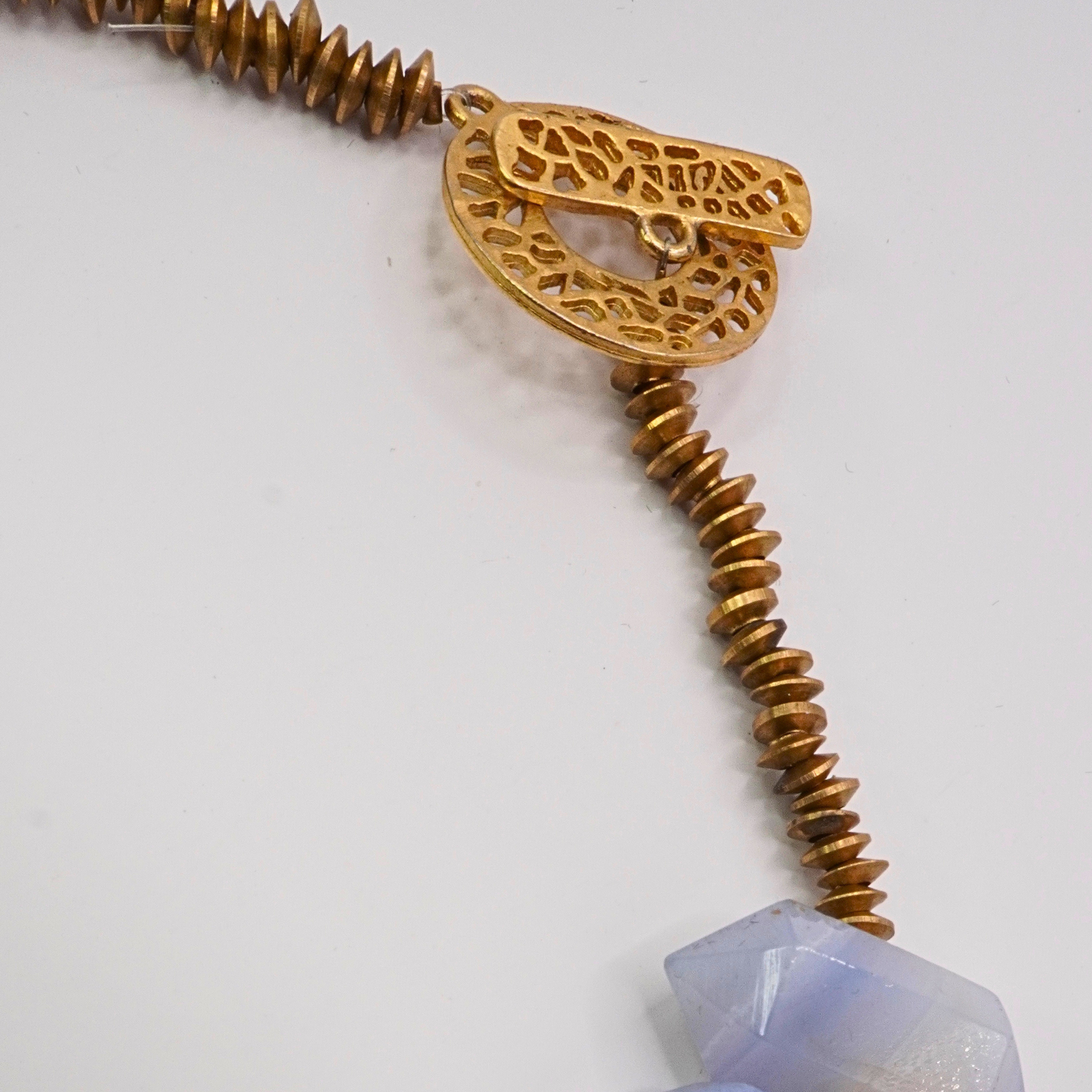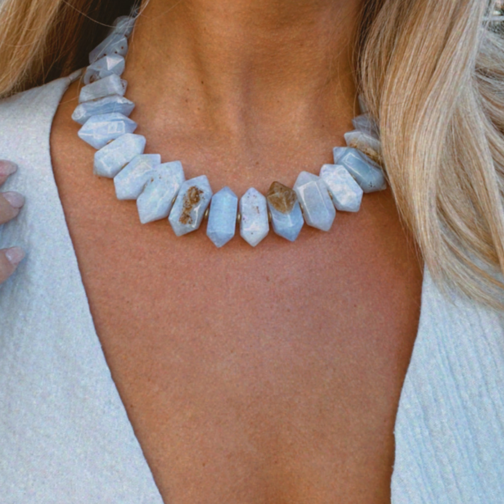 Soft shimmer with a bold shape. This collar necklace features glowing blue chalcedony stones arranged in a structured silhouette that hugs the neckline just right. Dreamy color meets a polished finish for a look that feels elevated but effortless.