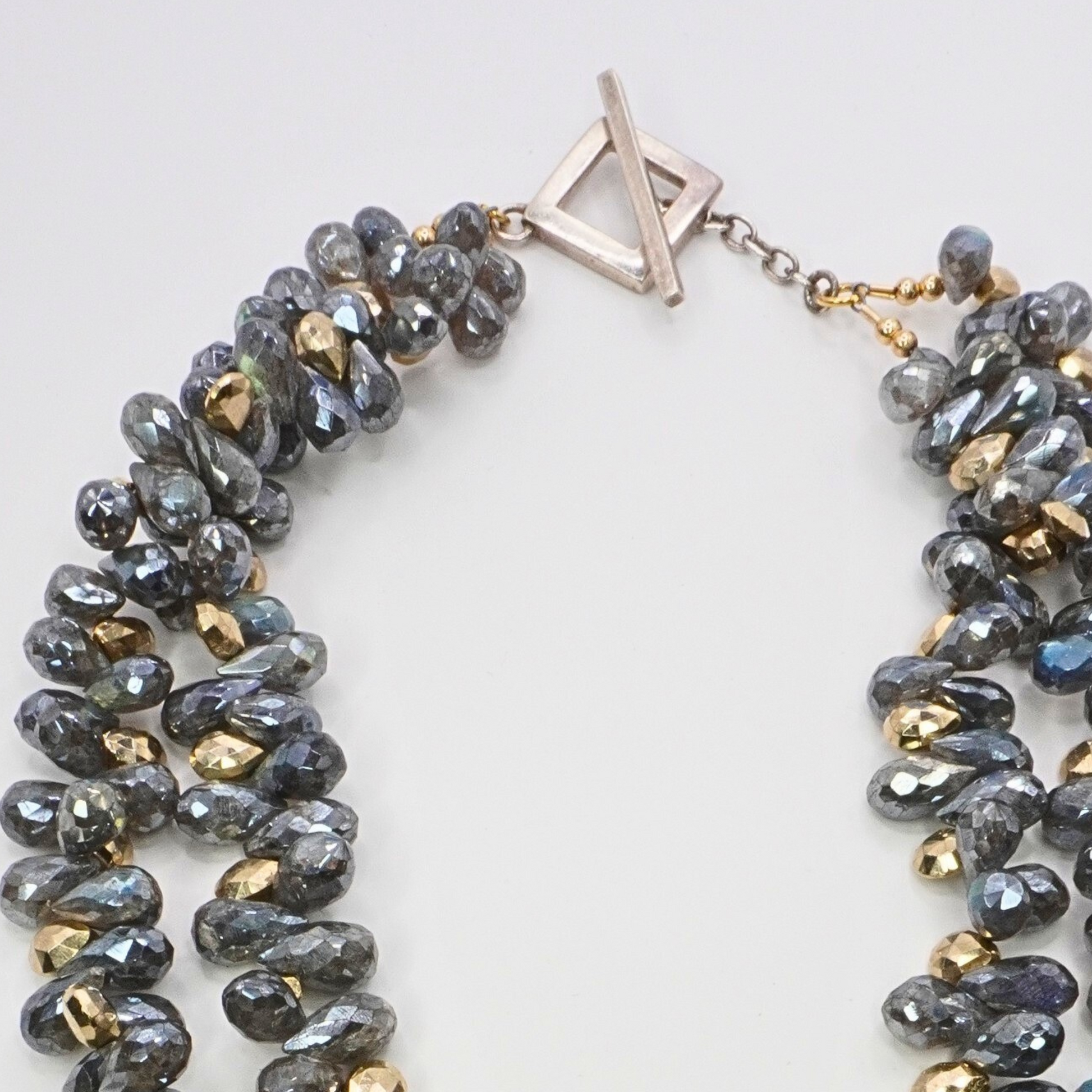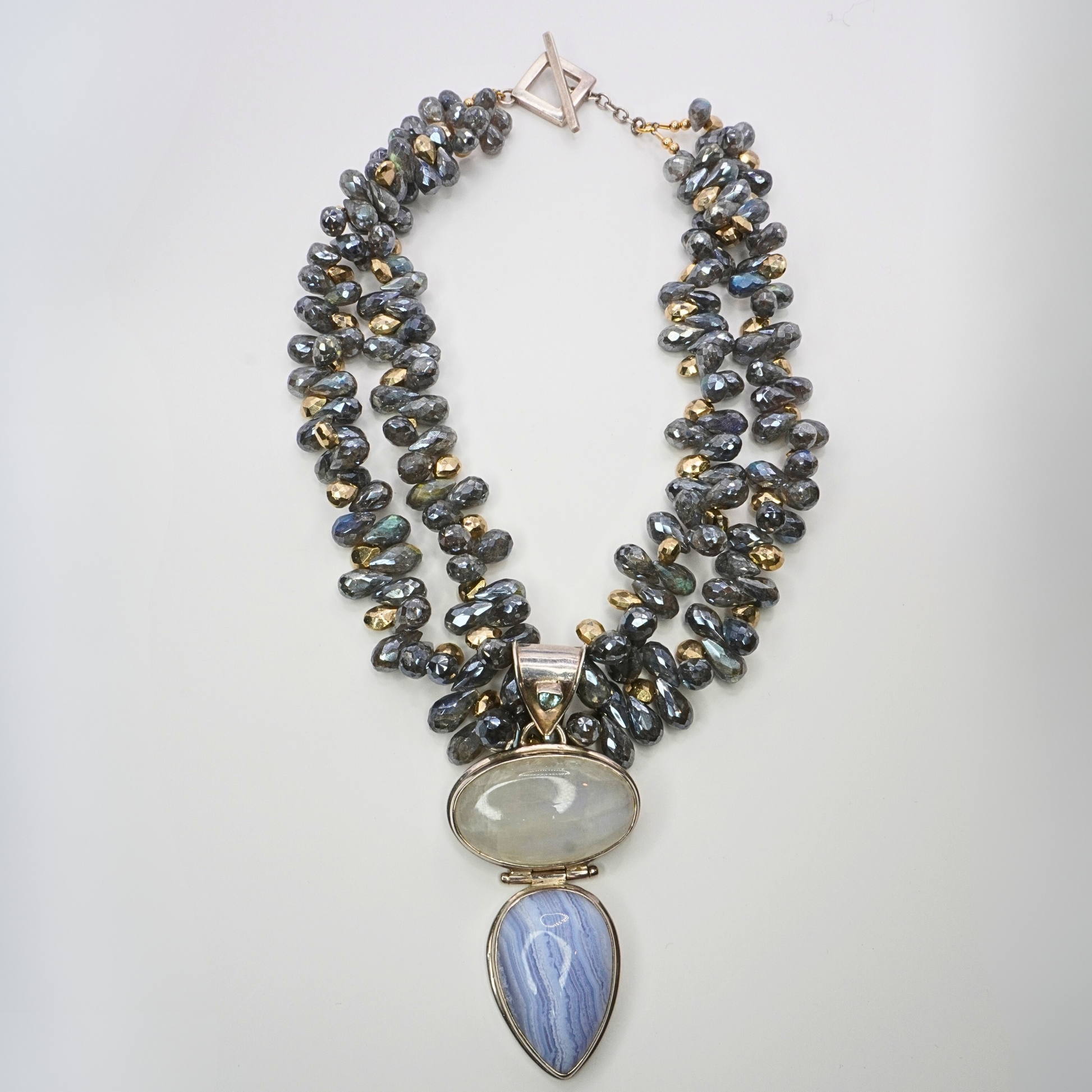 Like a tidepool in necklace form. This pendant combines calming aquamarine, luminous moonstone, and soft blue lace agate for a layered coastal look that feels serene and ethereal. Each stone brings a different glow, tied together with natural movement and light.