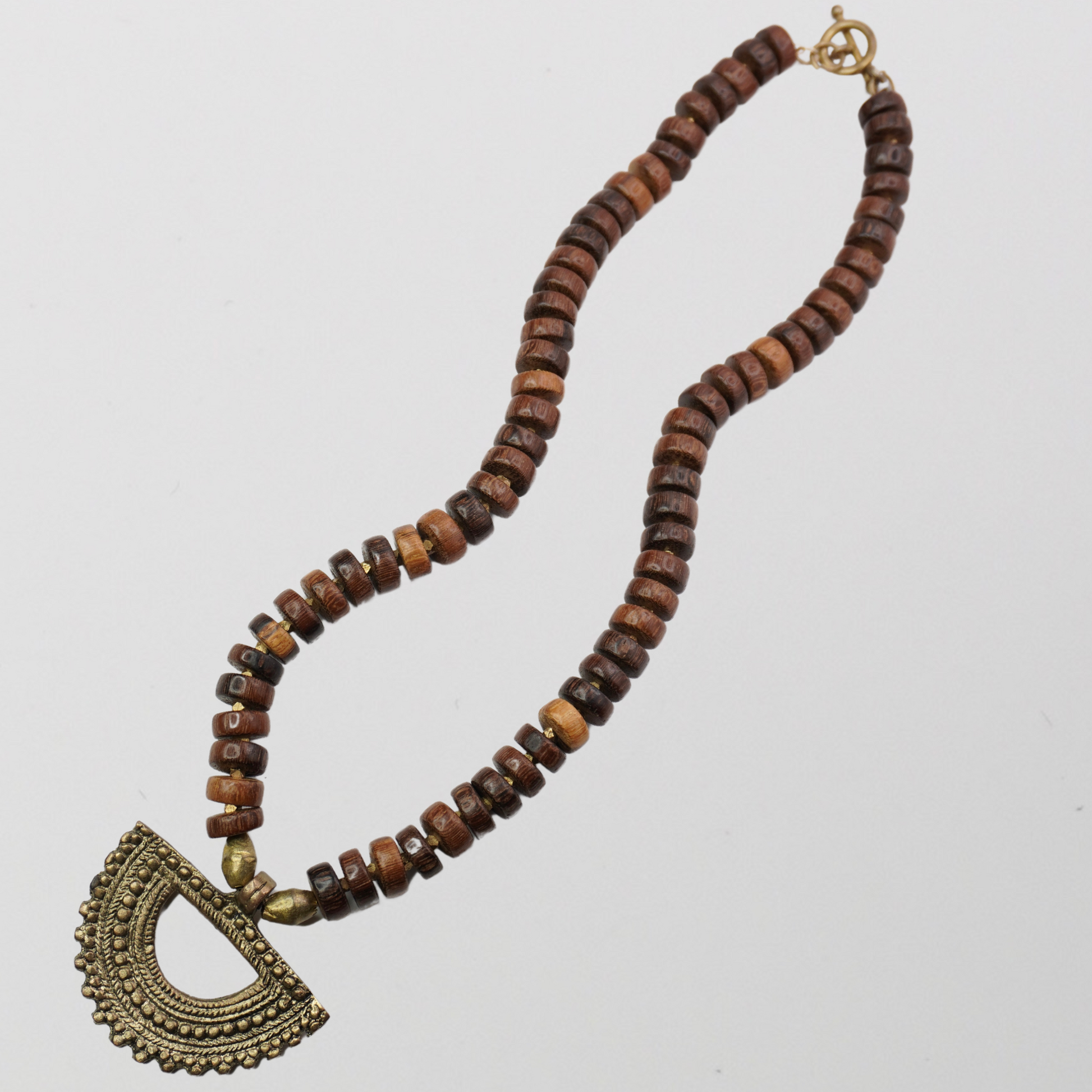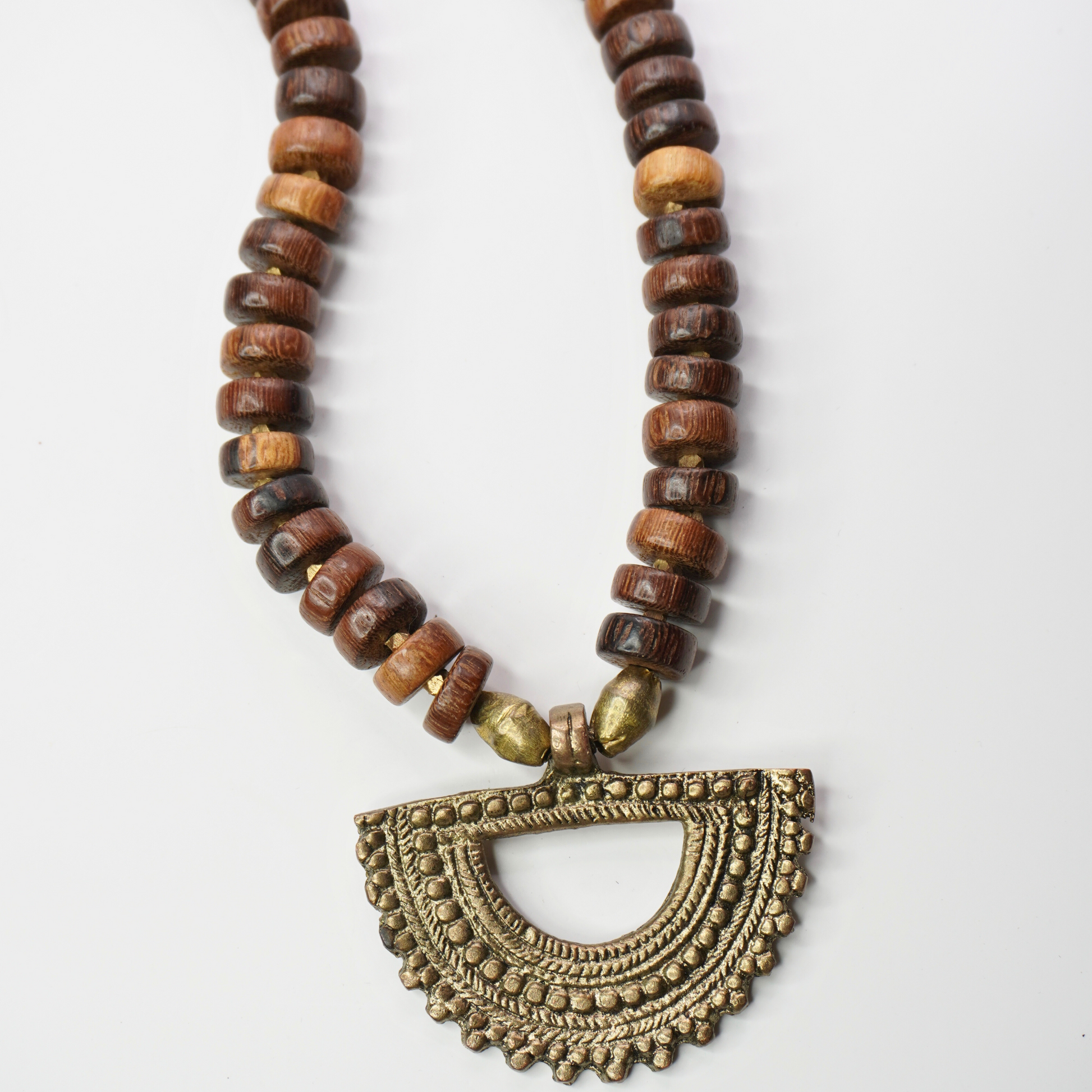 Earthy and elegant. Warm brass pairs with natural wood for a statement necklace that feels grounded and effortless.