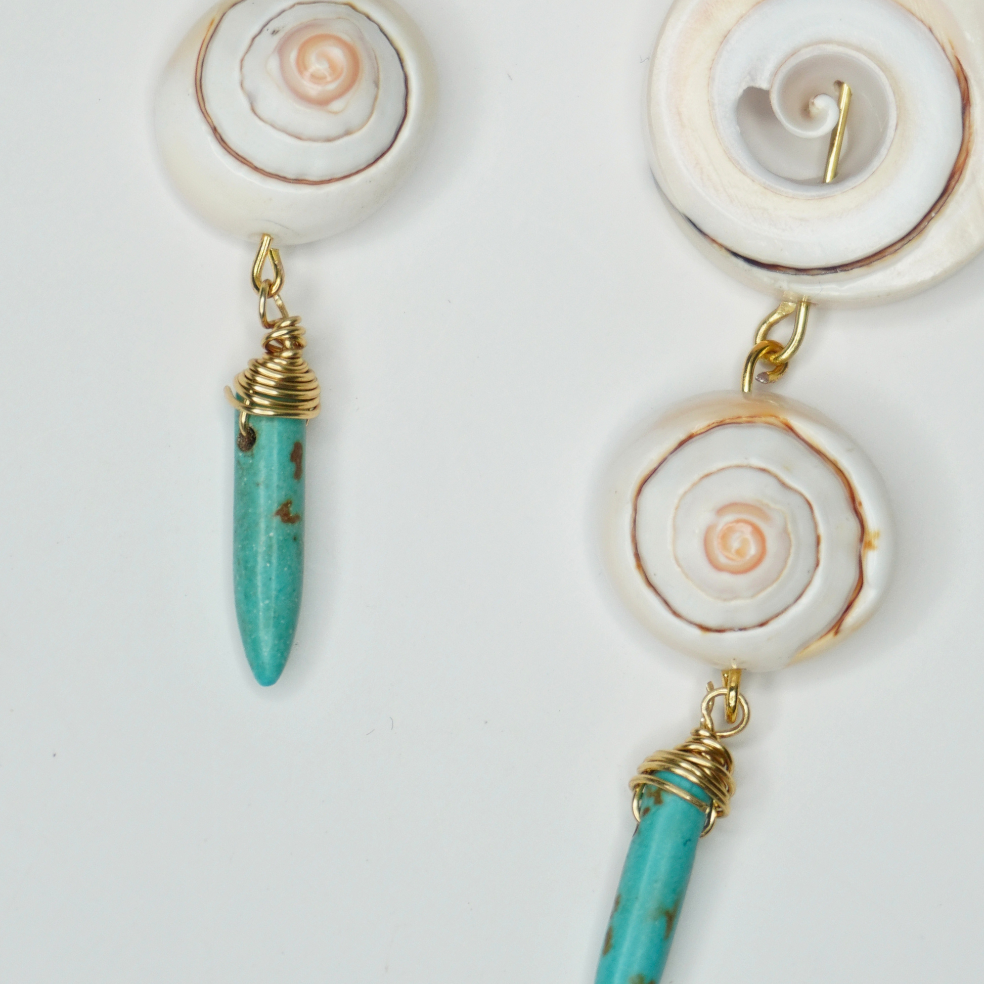 Like a beach day bottled up. These statement drops feature stacked spiral shells in soft ivory and blush tones, finished with turquoise dagger-style stones wrapped in gold wire. They’re playful, coastal, and full of movement.