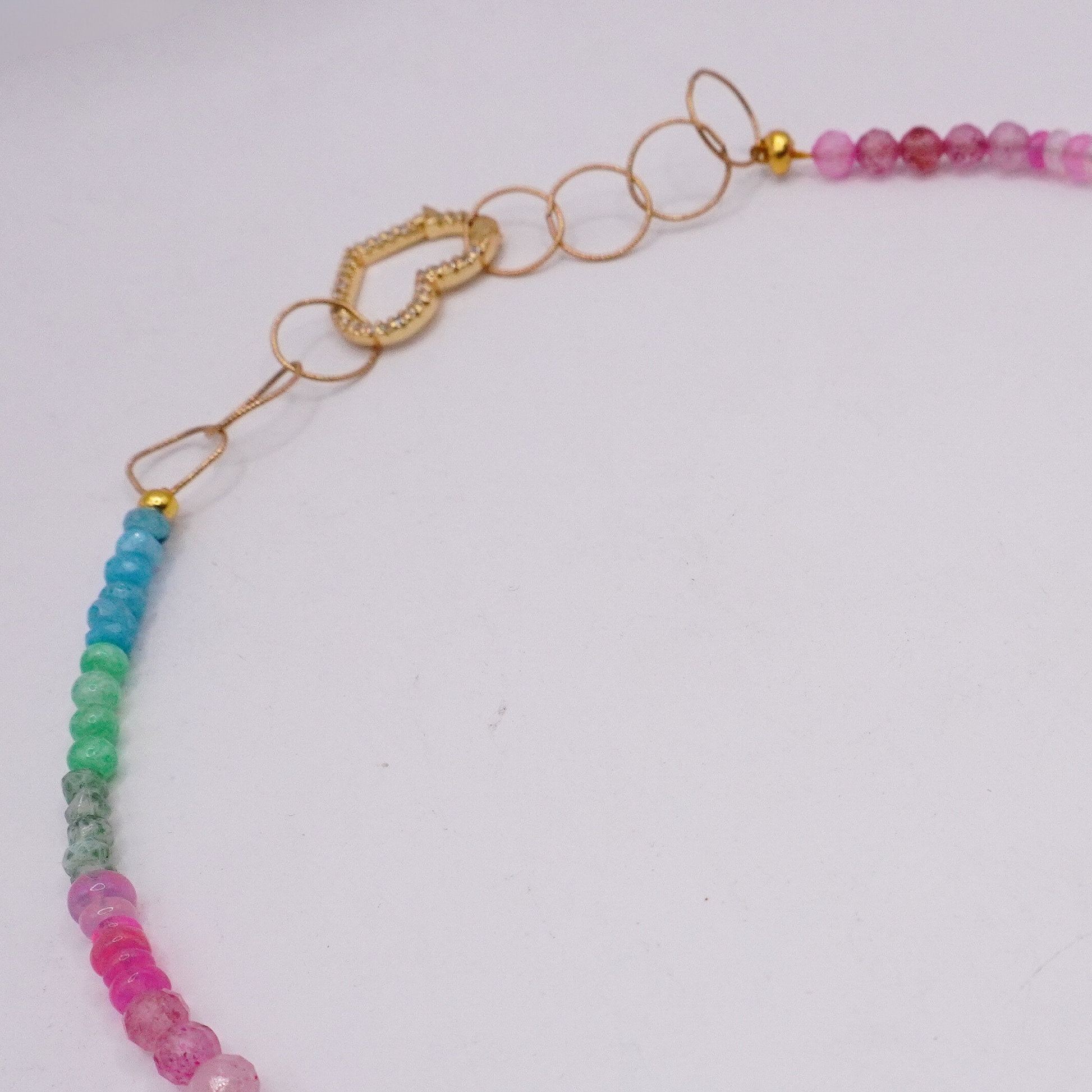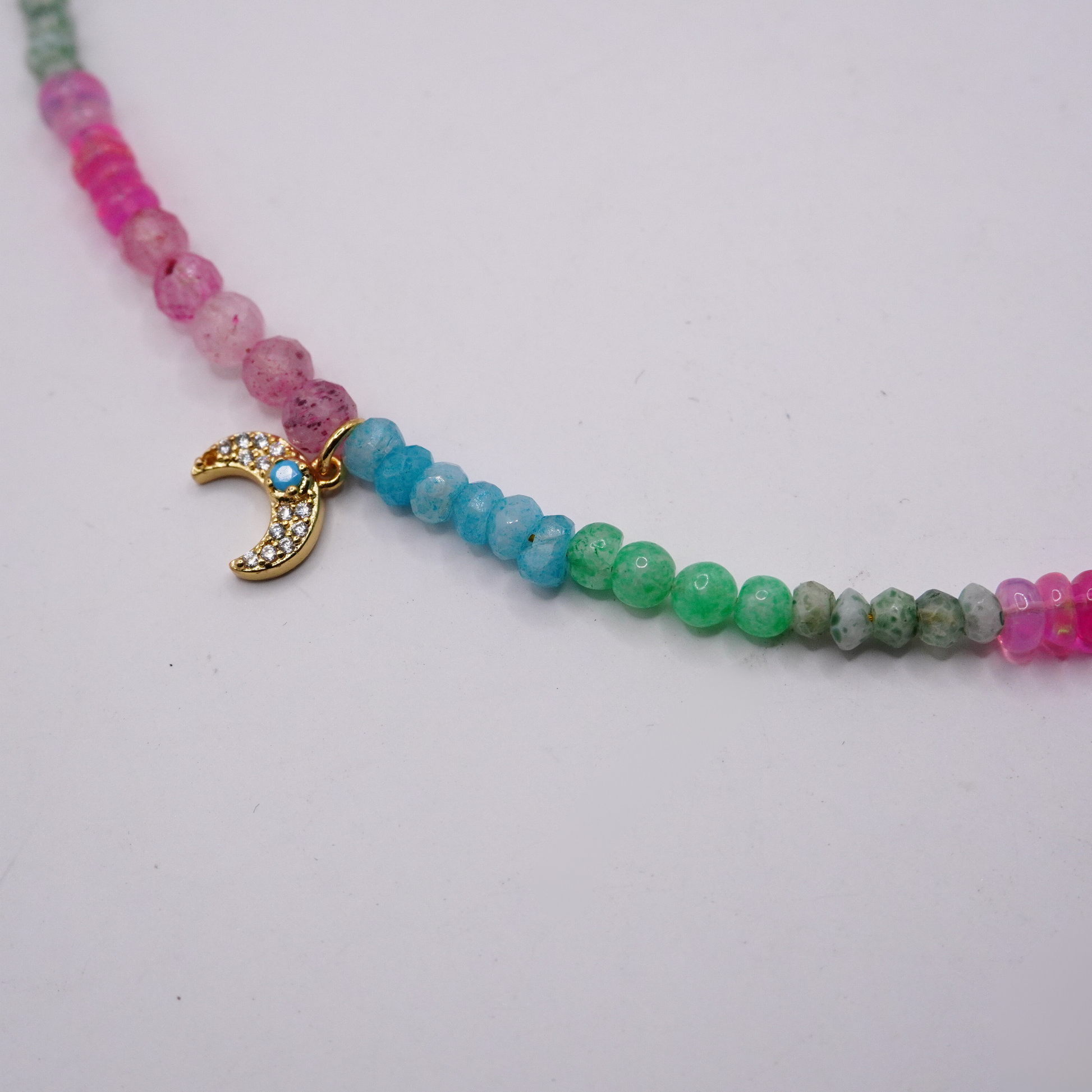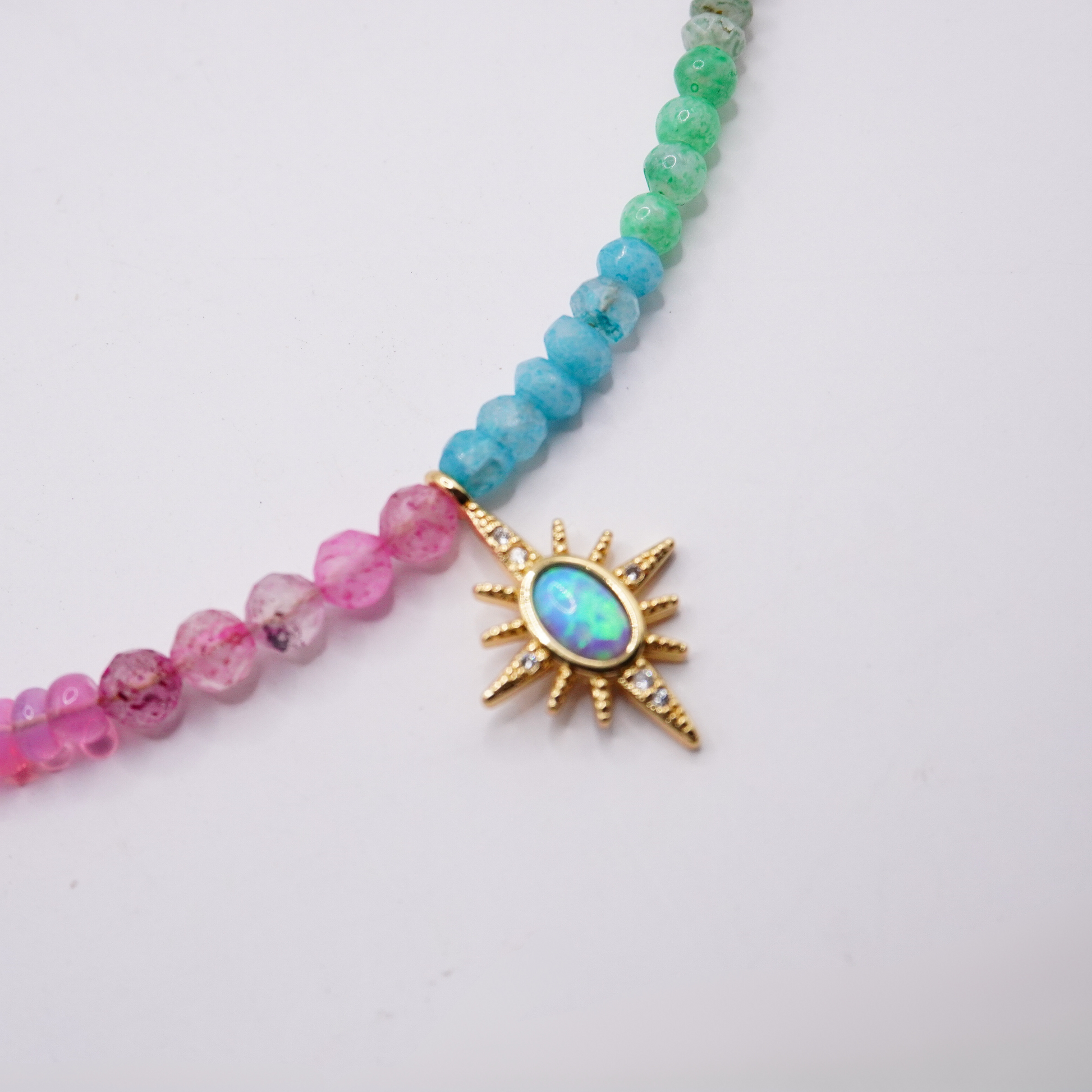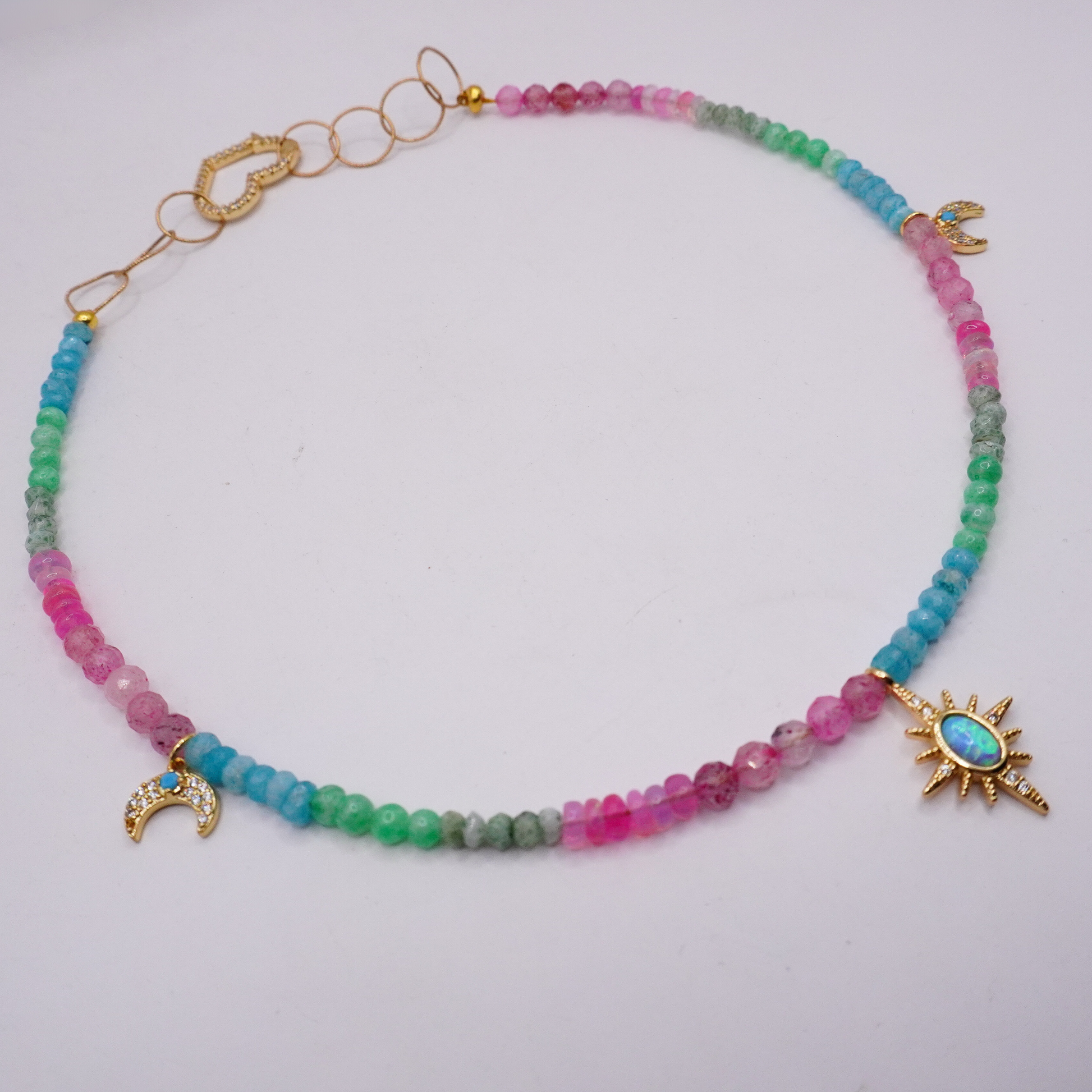 Dreamy and iridescent. This necklace pairs glowing moonstone with flashes of Ethiopian opal for a strand that catches the light and doesn’t let go.