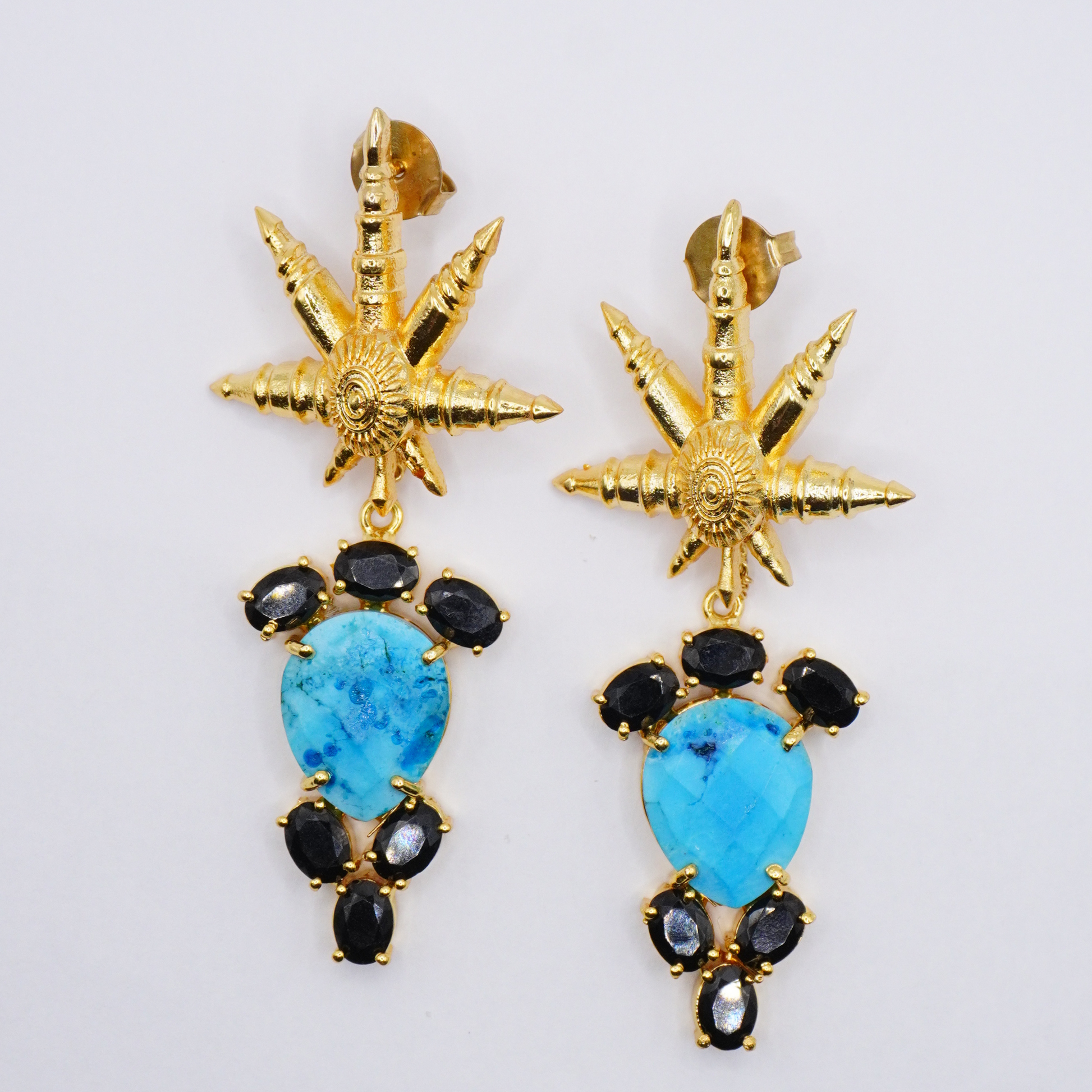 Big sun energy. These earrings feature radiant gold-plated starbursts with vibrant turquoise centers, framed by deep black spinel for a high contrast finish. They’re striking, sculptural, and built to shine from every angle.