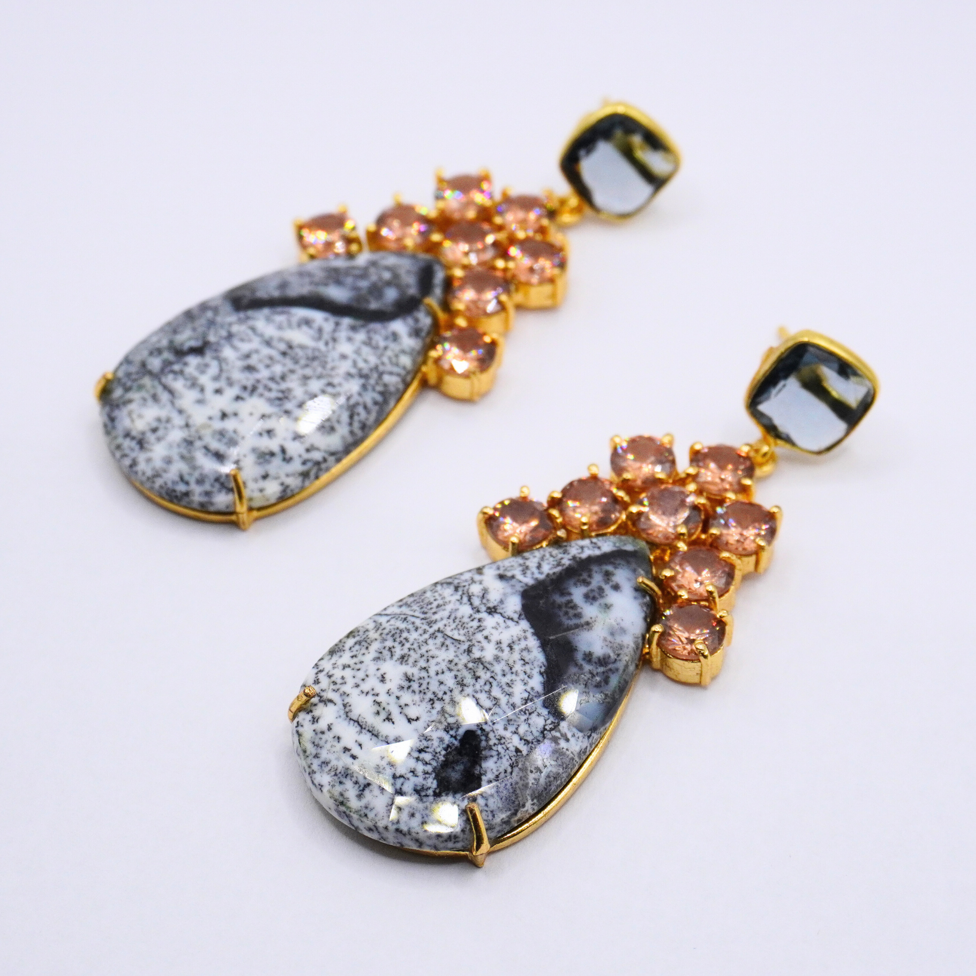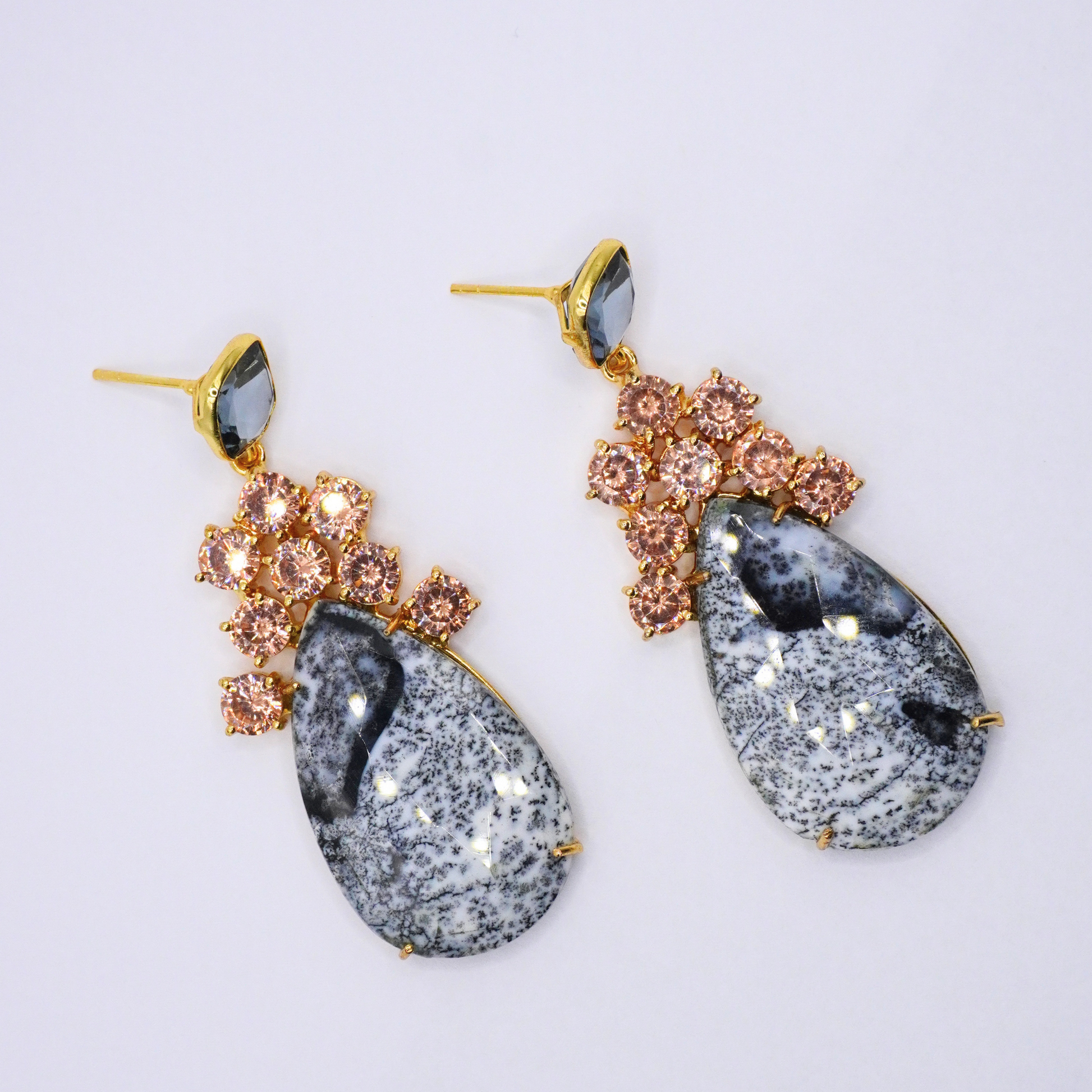 Grounded in nature, made to glow. These earrings feature natural dendritic opal drops framed in gold, accented by a cascade of blush-toned morganite CZ that catches the light just right. Each stone is naturally patterned, making every pair one of a kind, like a little piece of the earth dressed up for a night out.