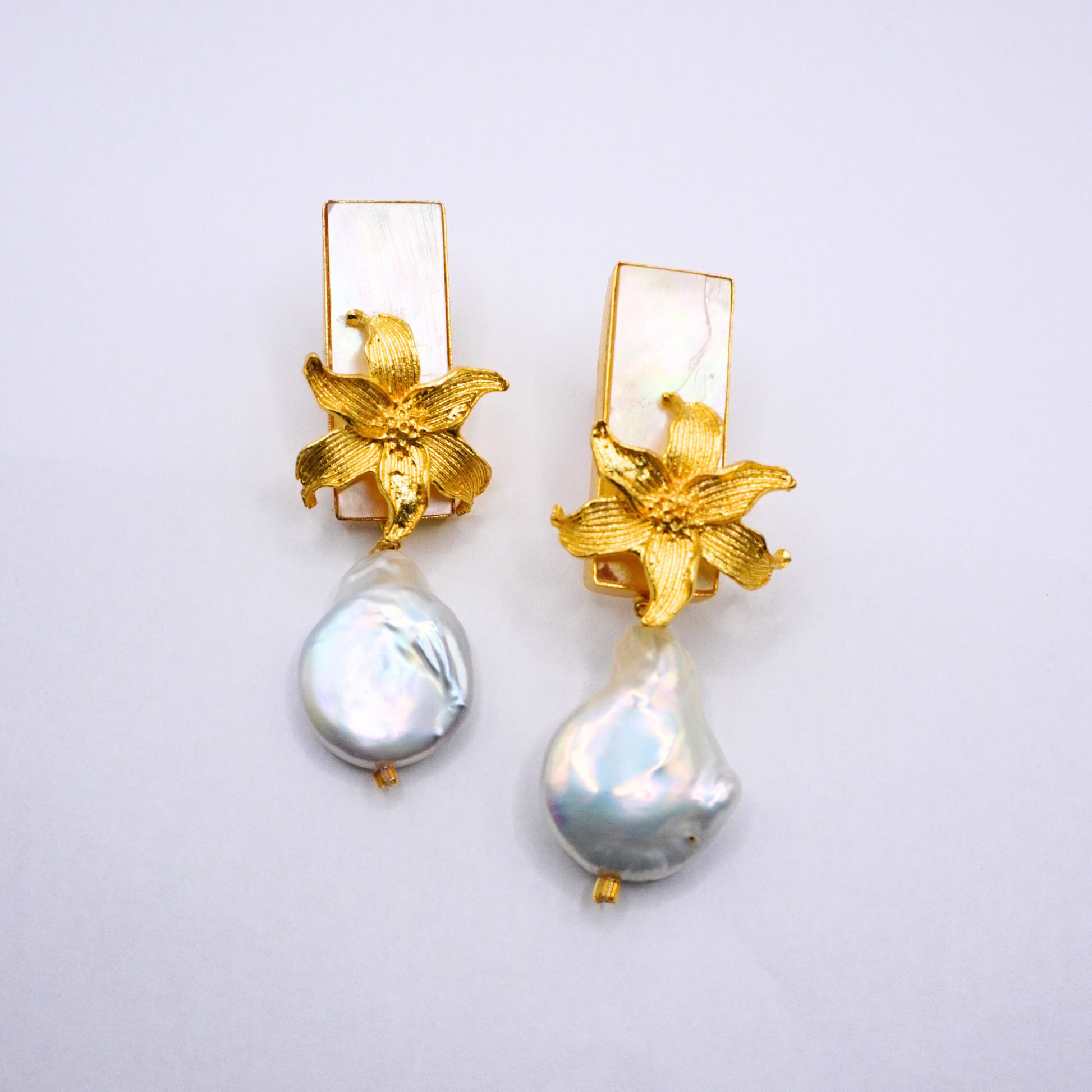 Golden hour in earring form. These handmade beauties pair rectangular mother of pearl posts with gold floral detailing and bold freshwater baroque pearl drops. Every pearl has its own natural curves and glow, giving each pair that perfectly imperfect finish. They're romantic, sculptural, and just the right amount of extra.