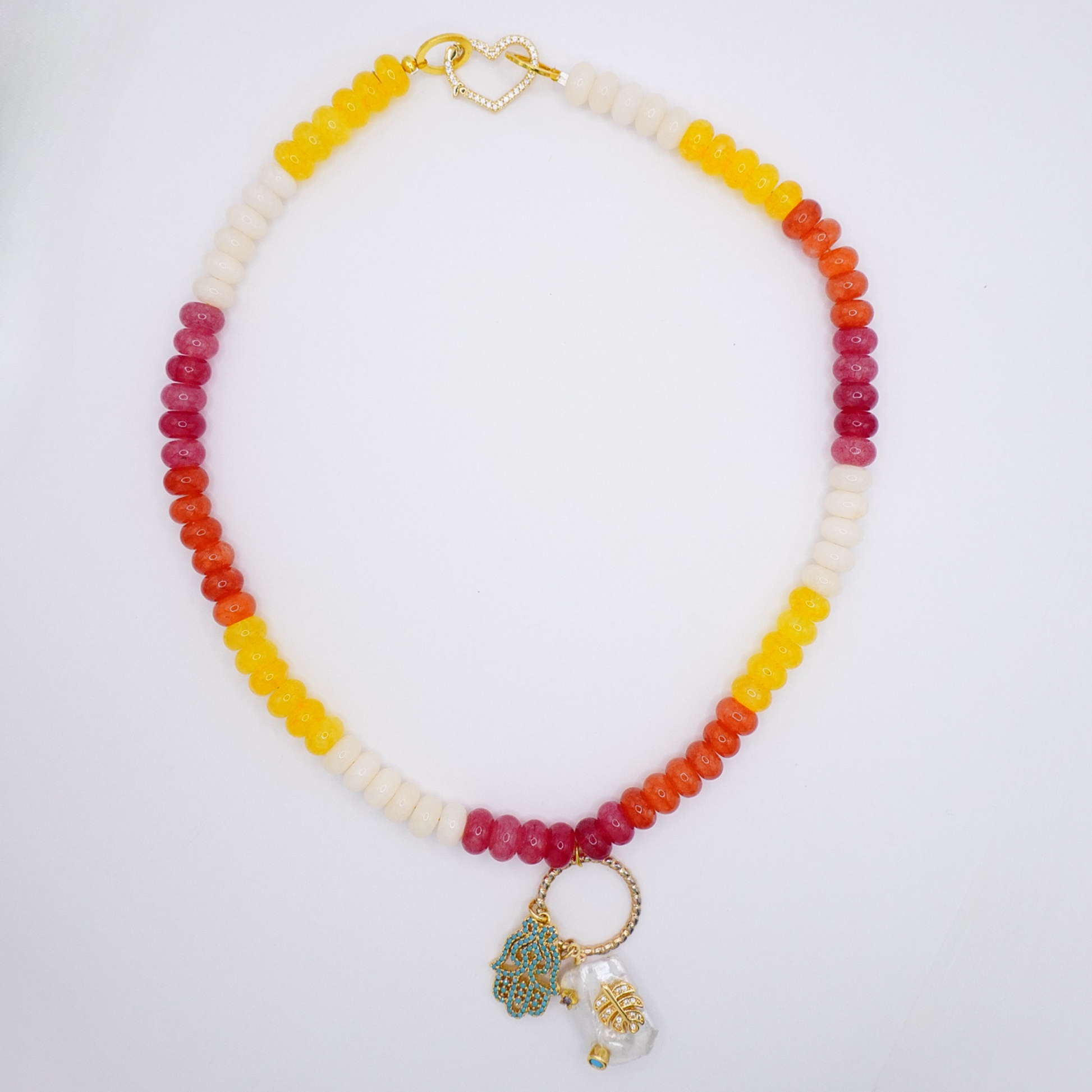 Pearls and charms. This necklace features a sweet cluster of charms mixed with colorful glass beads for a look that’s fun and spunky.