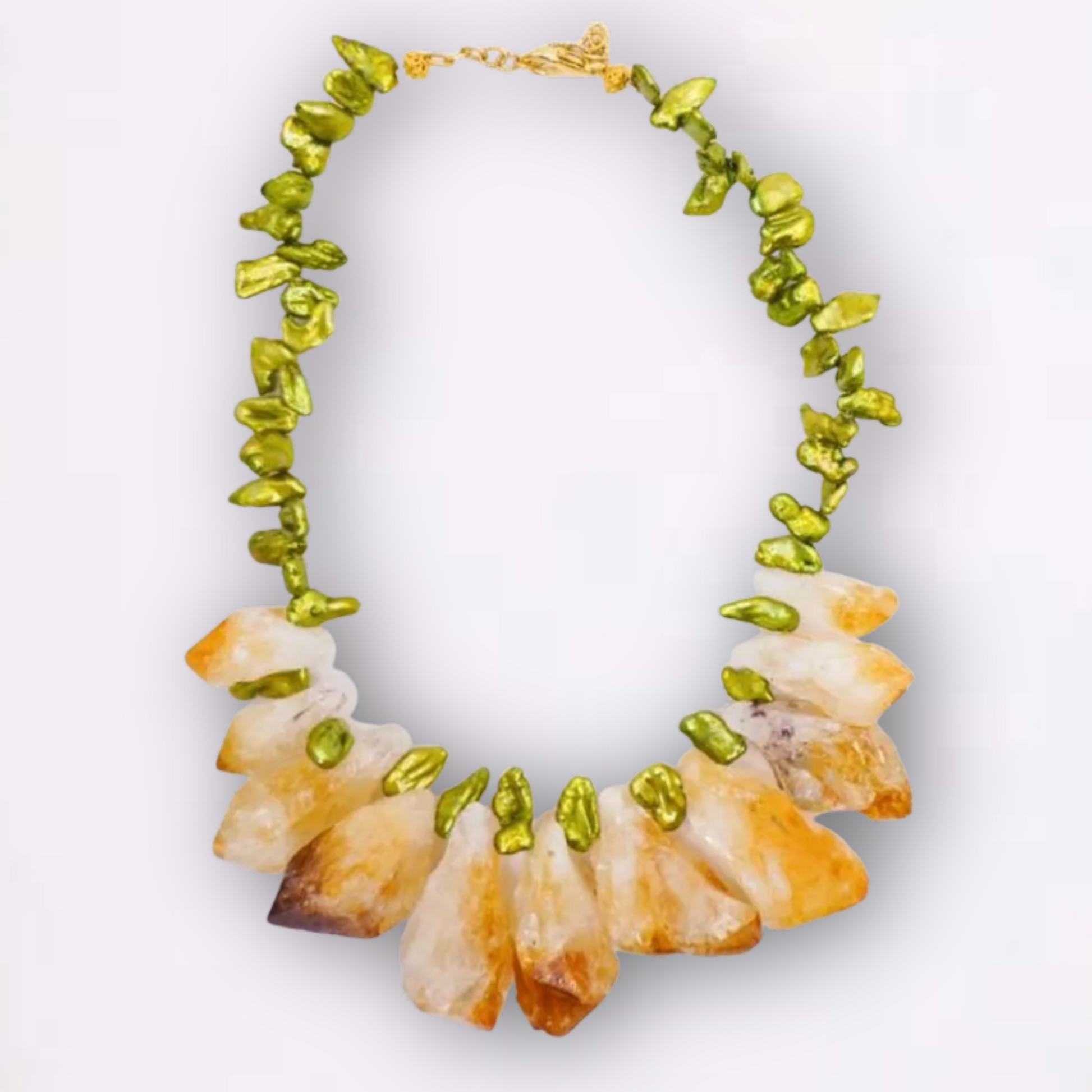 Raw and refined. This collar necklace blends chunky citrine crystals with smooth green pearls for a piece that feels both grounded and glam.