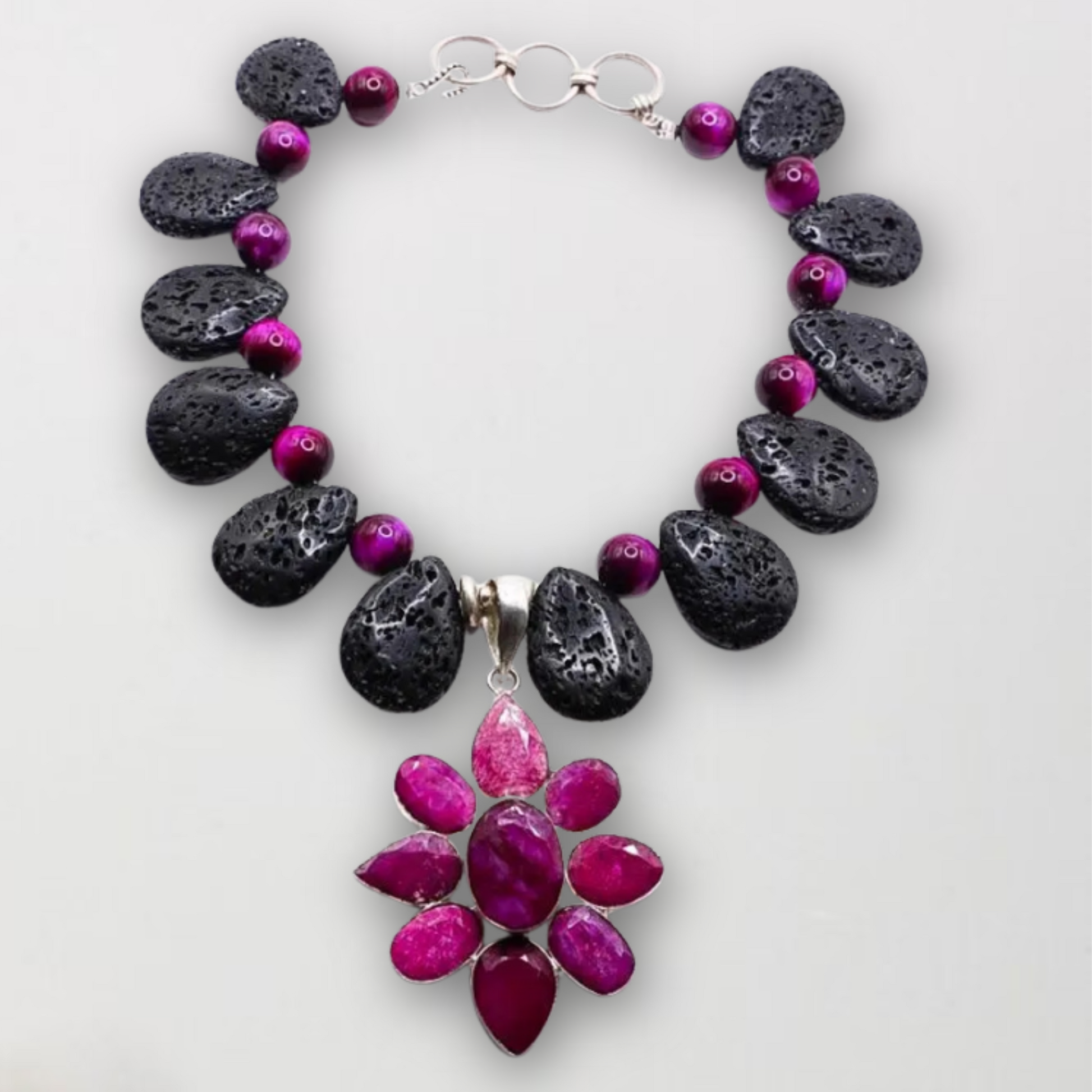 A power combo. This collar necklace blends raw lava rock, warm pink tiger’s eye, and a striking ruby pendant for a bold, grounded look.