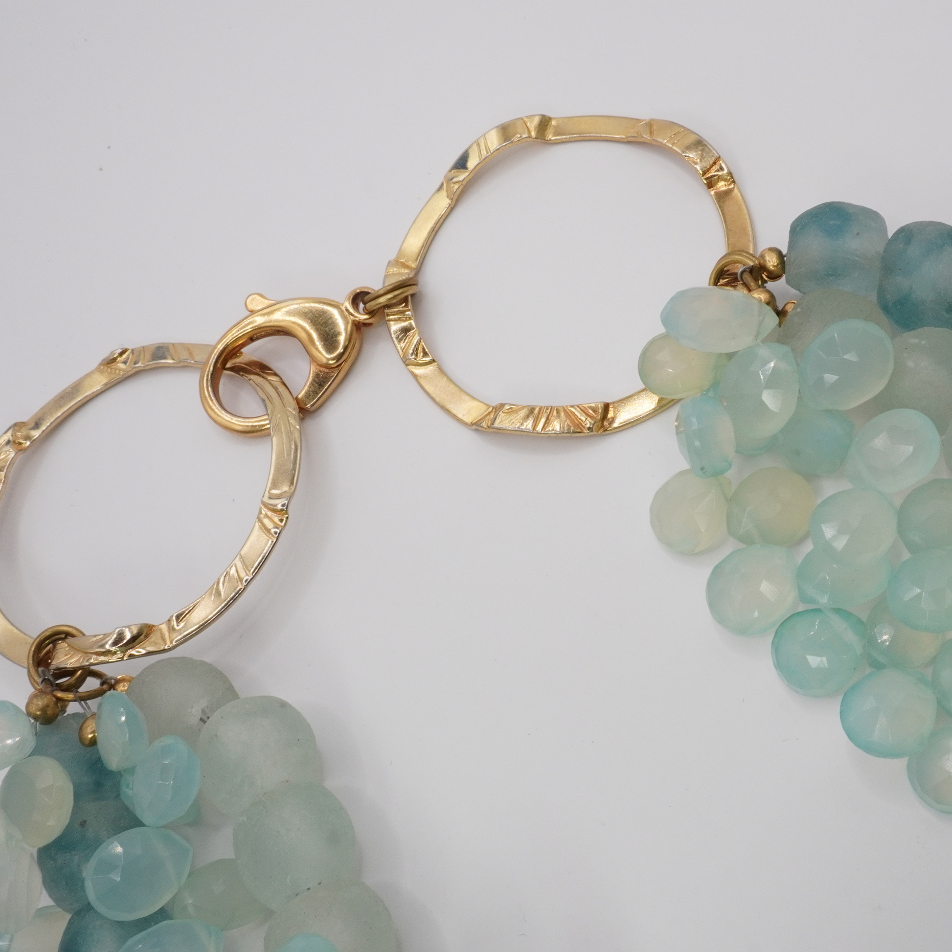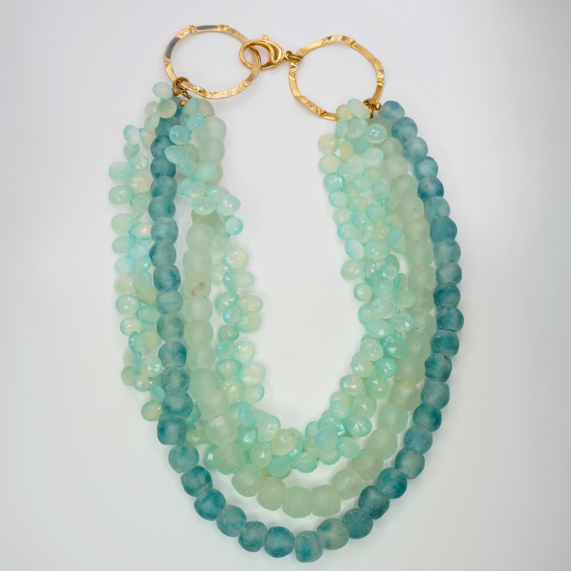 Soft, frosty, and serene. This necklace features pale blue chalcedony paired with sea glass beads for a refreshing, ocean-inspired palette.