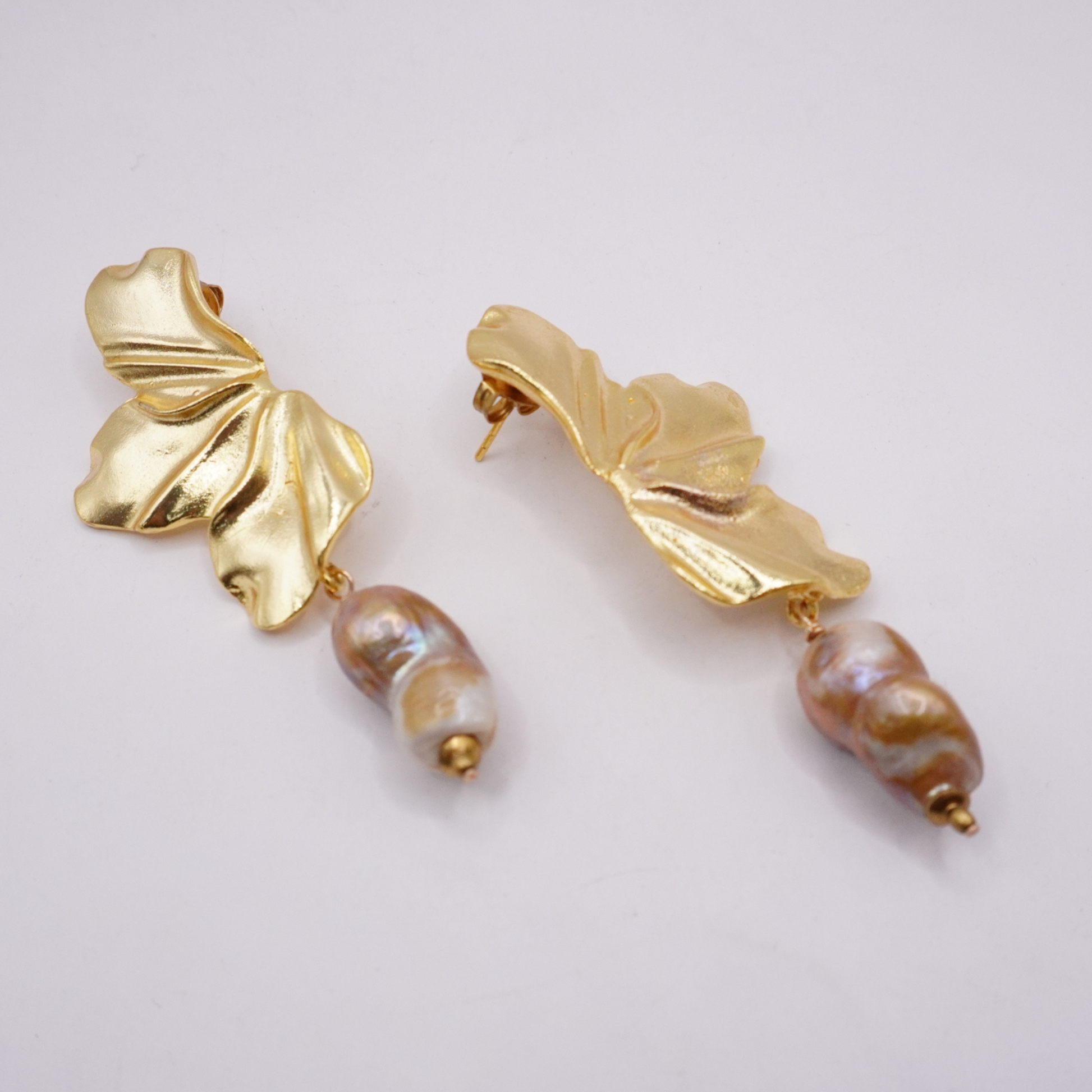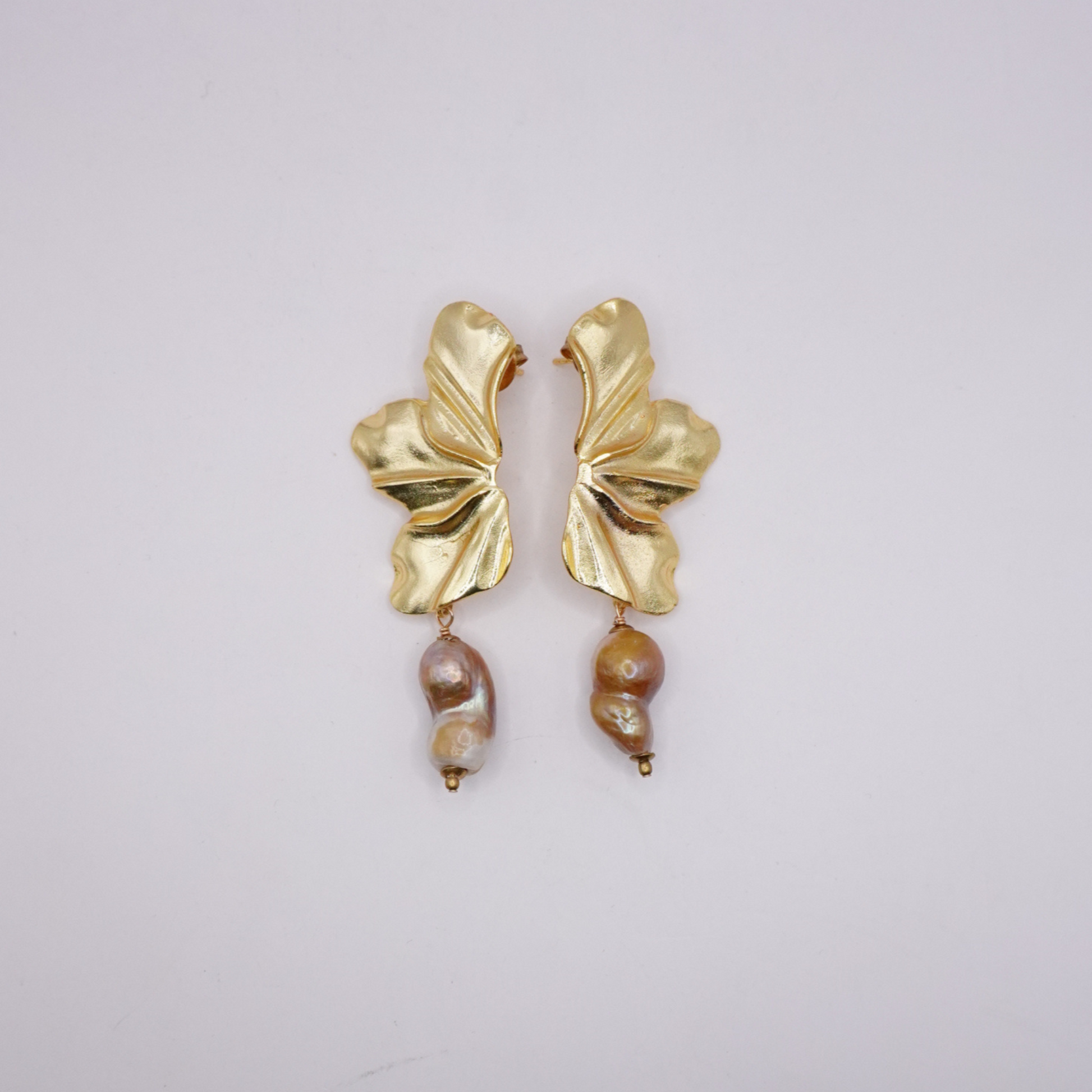 Lush, sculptural, and undeniably chic. These earrings feature fluttery gold-plated petals paired with organic freshwater pearls for an effortlessly elegant look. Each pearl is one of a kind, giving every pair its own unique charm.