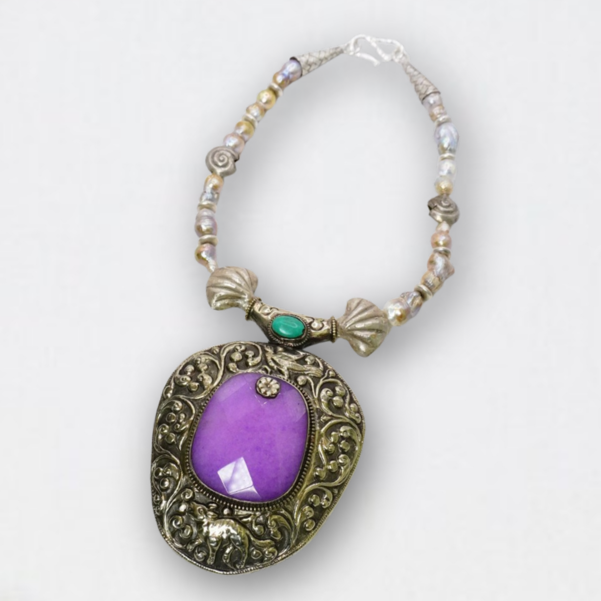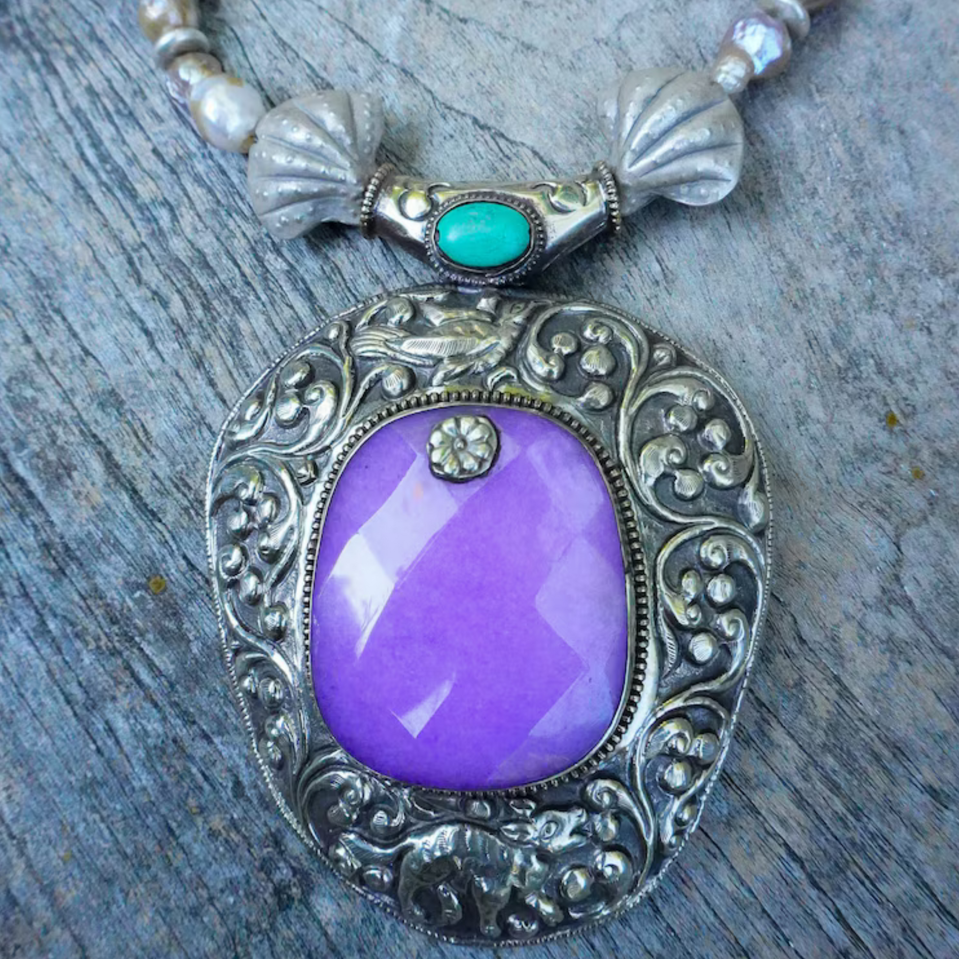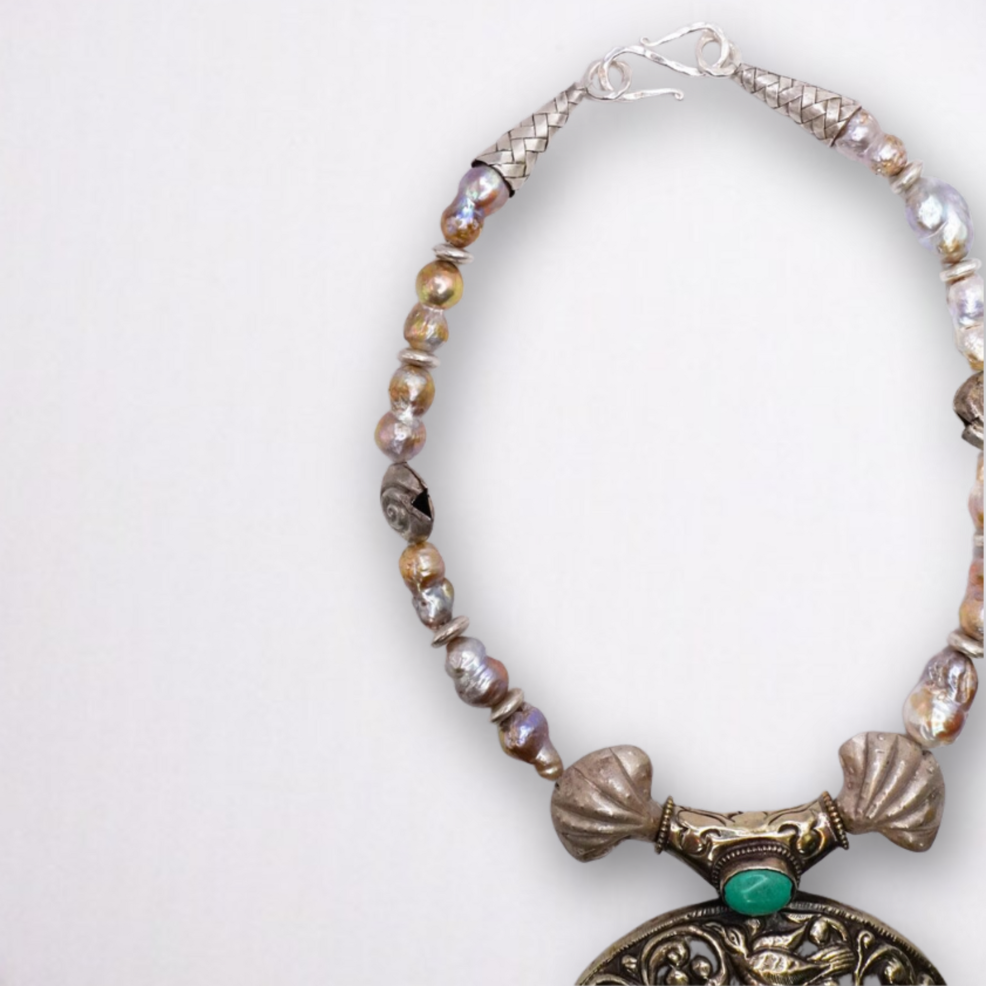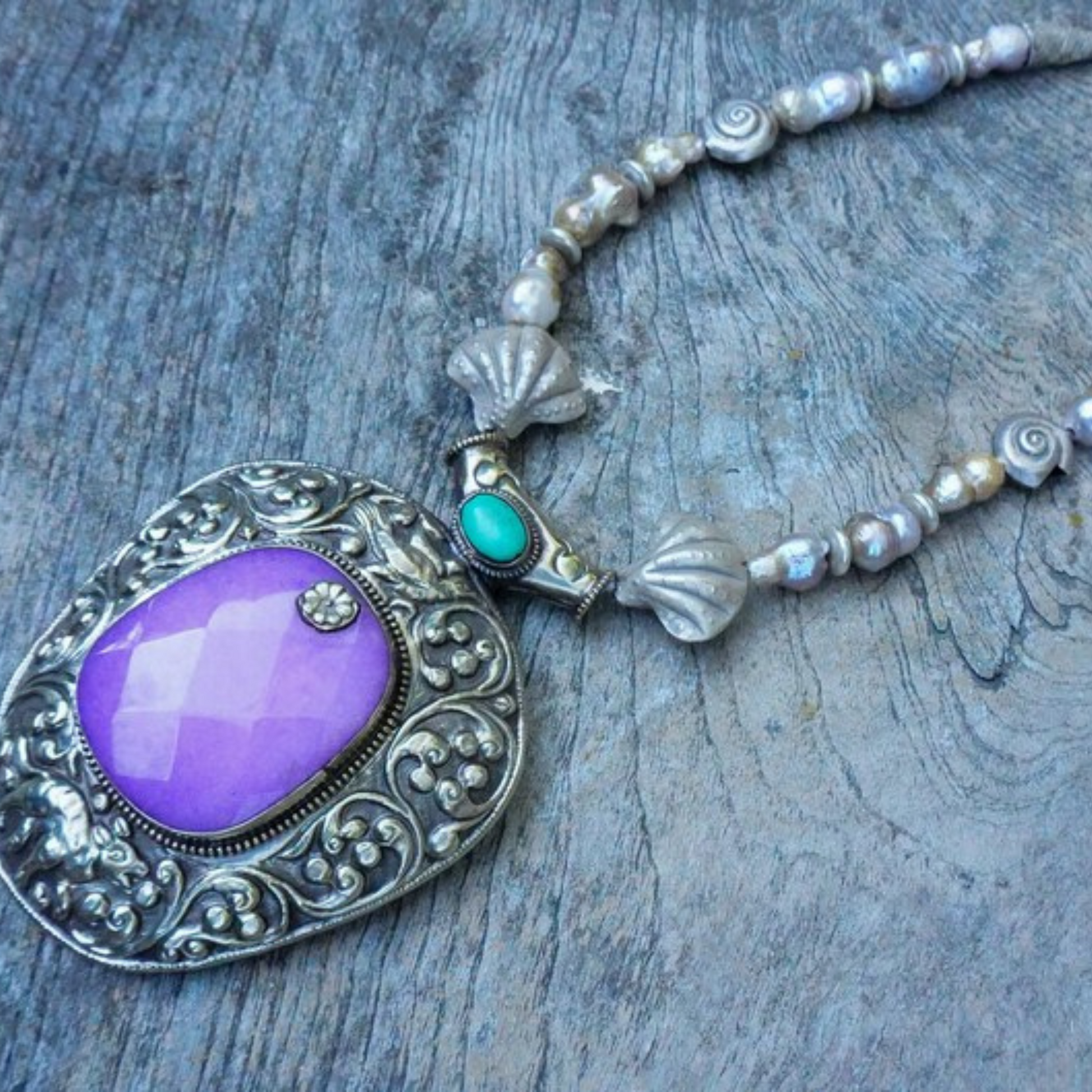 - Sterling silver shell pendant with quartz and turquoise