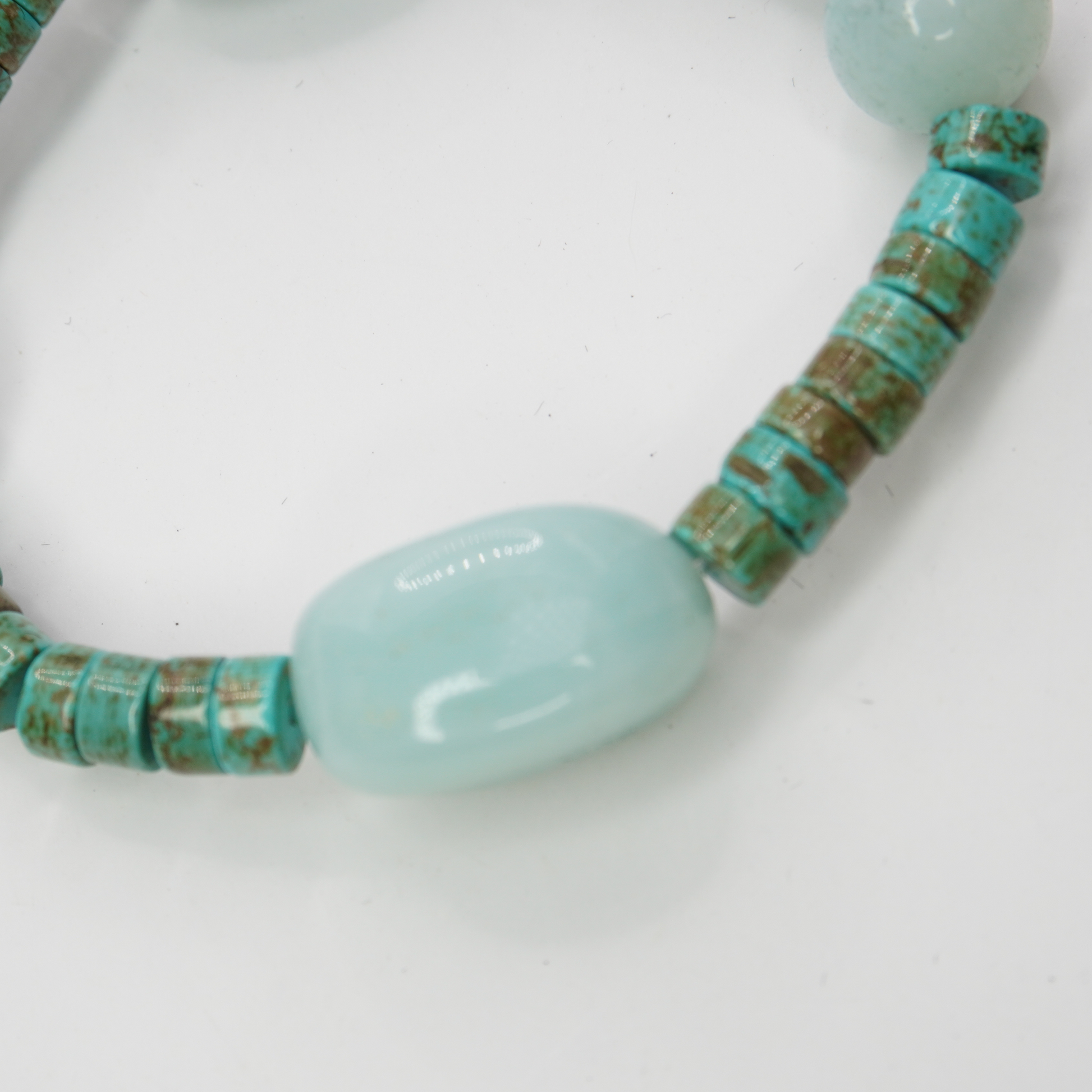 This bracelet brings desert and ocean energy together. Cool turquoise and soft amazonite beads create a breezy mix of blues and greens that looks amazing with linen, denim, or a tan.