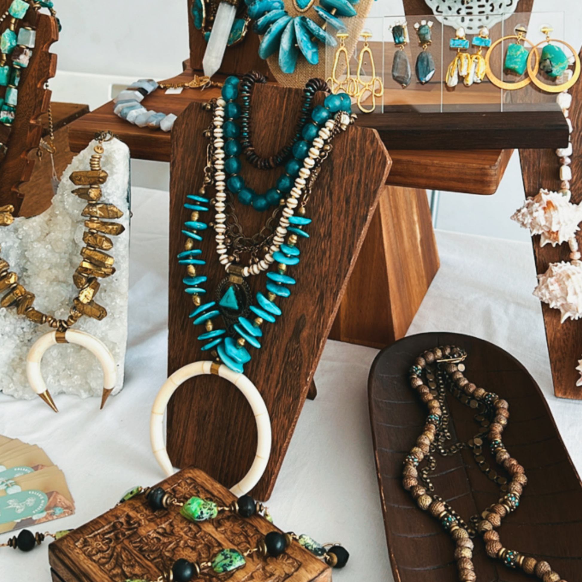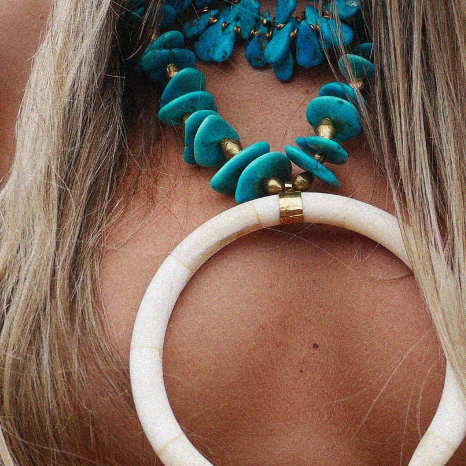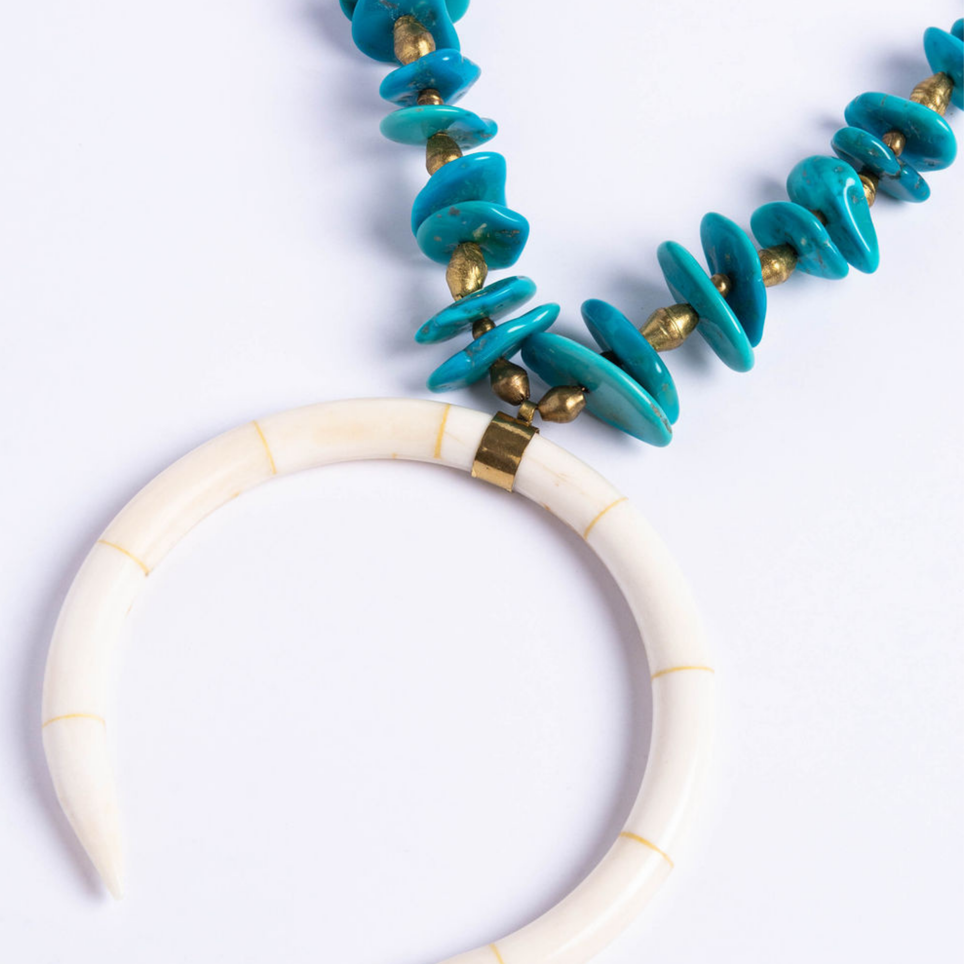 Big, bold, and ready to roam. This statement necklace features chunky turquoise beads paired with a carved white horn pendant for a look that’s earthy, striking, and full of soul.