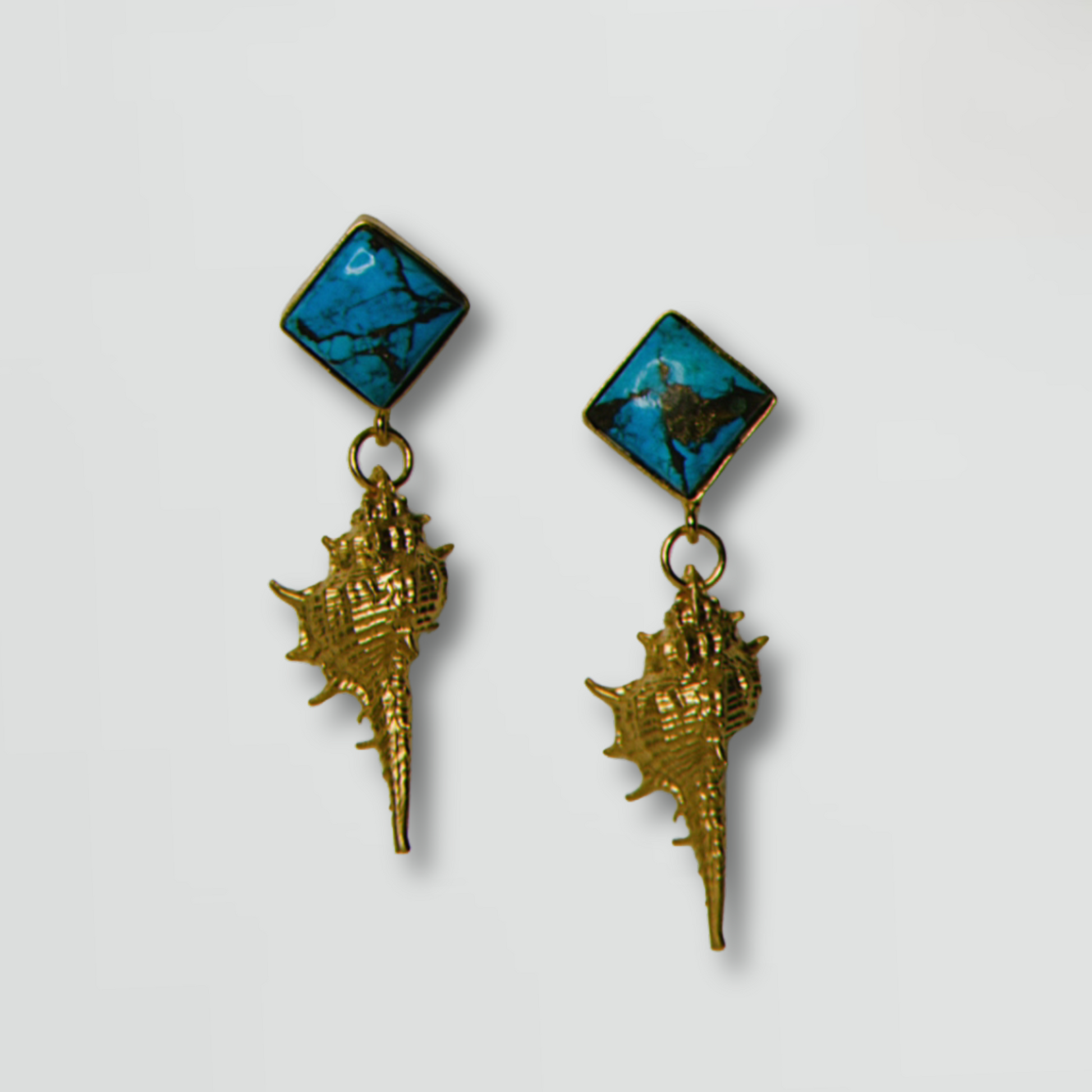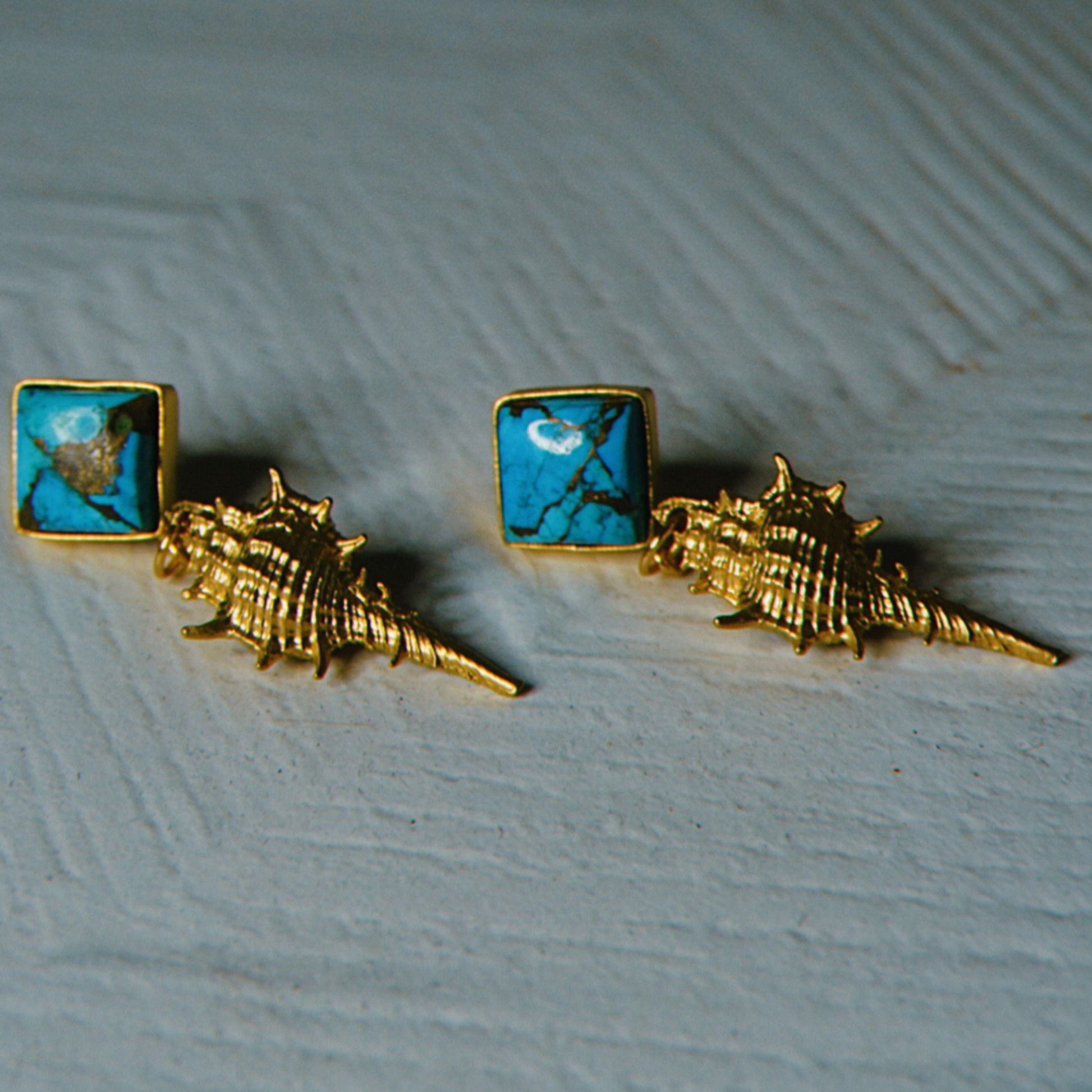 A love letter to island days and salty skin. These earrings pair vibrant turquoise stones with gold-plated conch shell drops for a bold yet beachy finish. They’re lightweight, full of wanderlust, and ready to explore.