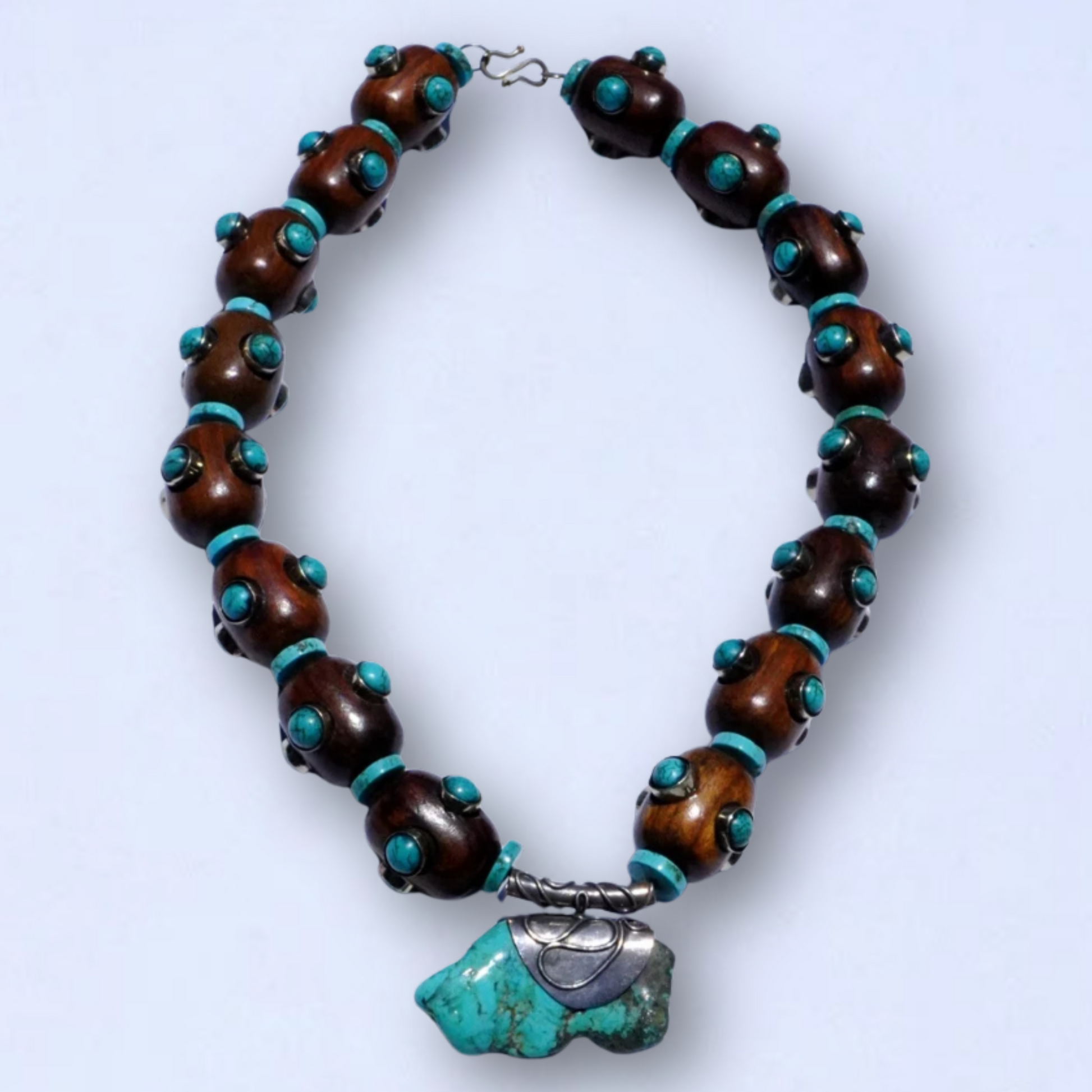 Rustic meets radiant. Natural wood beads create a warm base for vibrant turquoise accents that pop just enough to catch attention.